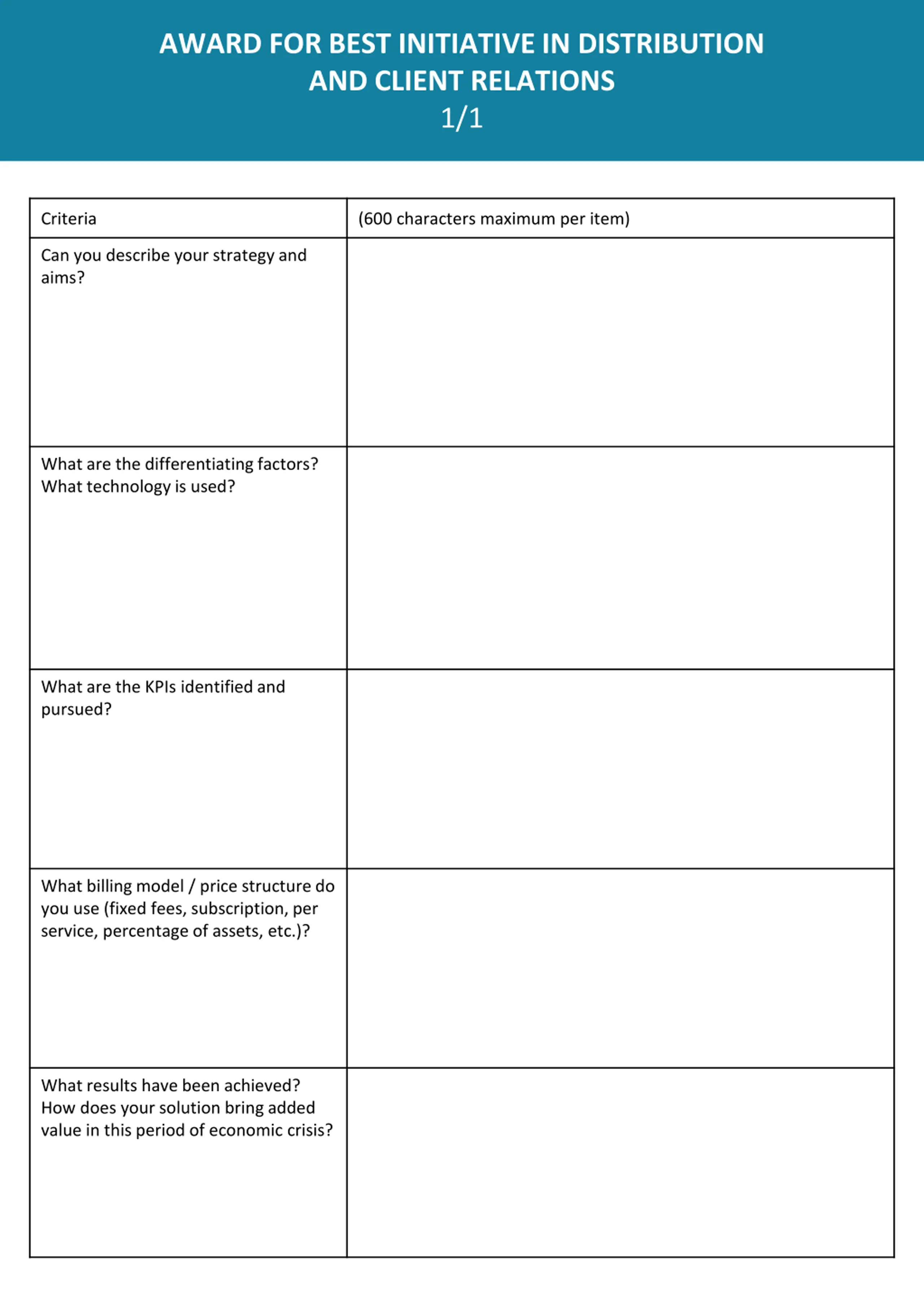 AWARD FOR BEST INITIATIVE IN DISTRIBUTION AND CLIENT RELATIONS 1/1 Criteria (600 characters maximum per item) Can you describe your strategy and aims? What are the differentiating factors? What technology is used? What are the KPIs identified and pursued? What billing model / price structure do you use (fixed fees, subscription, per service, percentage of assets, etc.)? What results have been achieved? How does your solution bring added value in this period of economic crisis?
