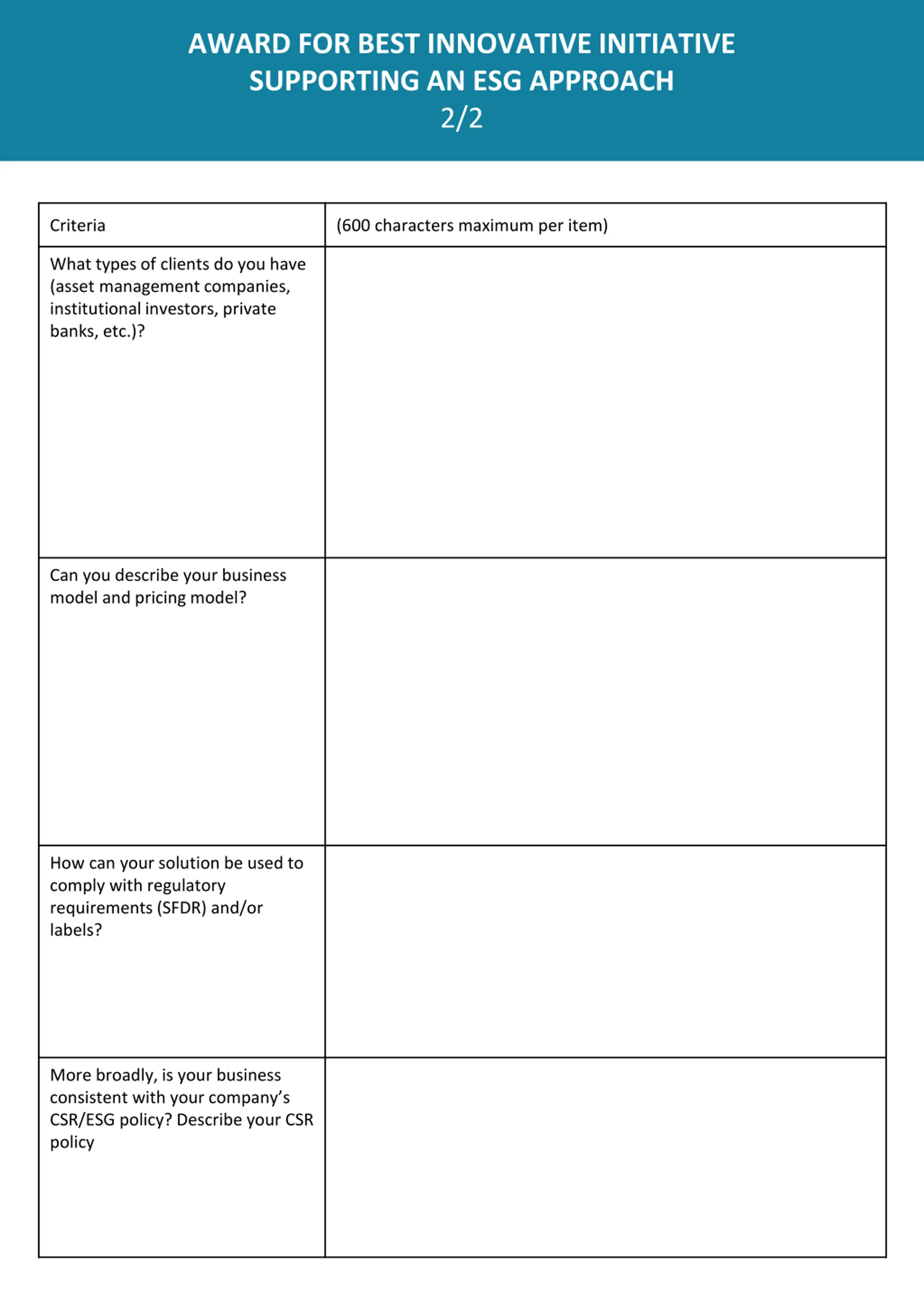 AWARD FOR BEST INNOVATIVE INITIATIVE SUPPORTING AN ESG APPROACH 2/2 Criteria (600 characters maximum per item) What types of clients do you have (asset management companies, institutional investors, private banks, etc.)? Can you describe your business model and pricing model? How can your solution be used to comply with regulatory requirements (SFDR) and/or labels? More broadly, is your business consistent with your company s CSR/ESG policy? Describe your CSR policy