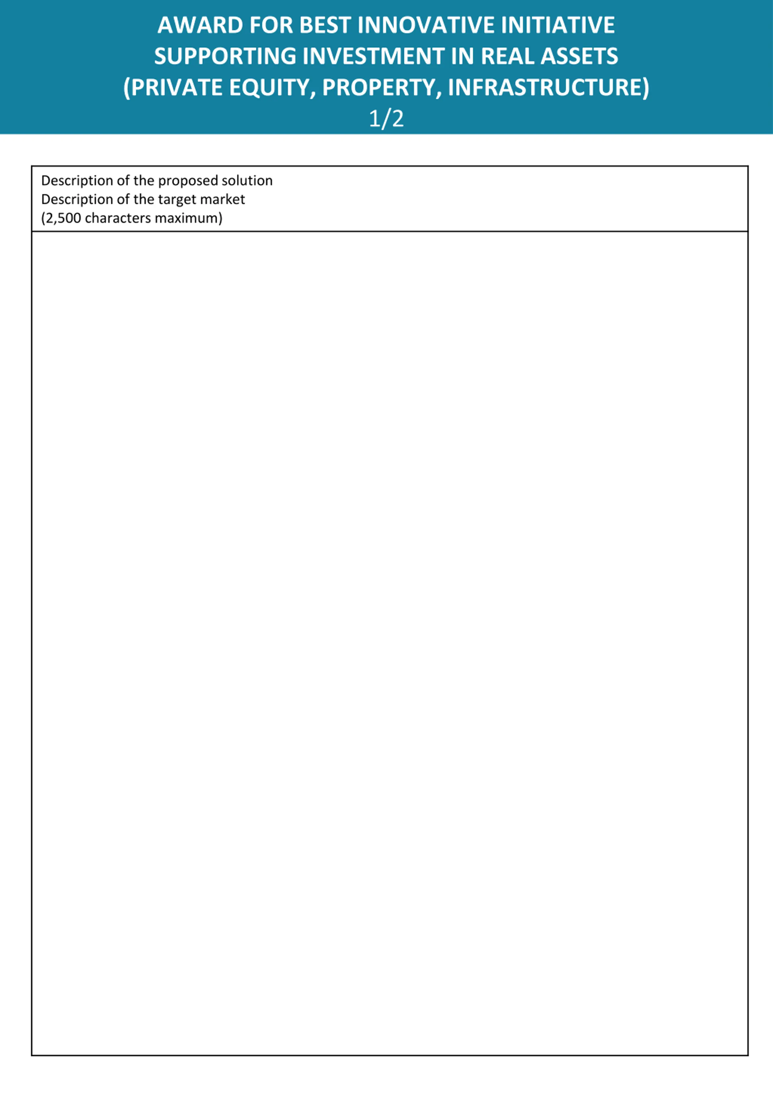 AWARD FOR BEST INNOVATIVE INITIATIVE SUPPORTING INVESTMENT IN REAL ASSETS (PRIVATE EQUITY, PROPERTY, INFRASTRUCTURE) 1/2 Description of the proposed solution Description of the target market (2,500 characters maximum)