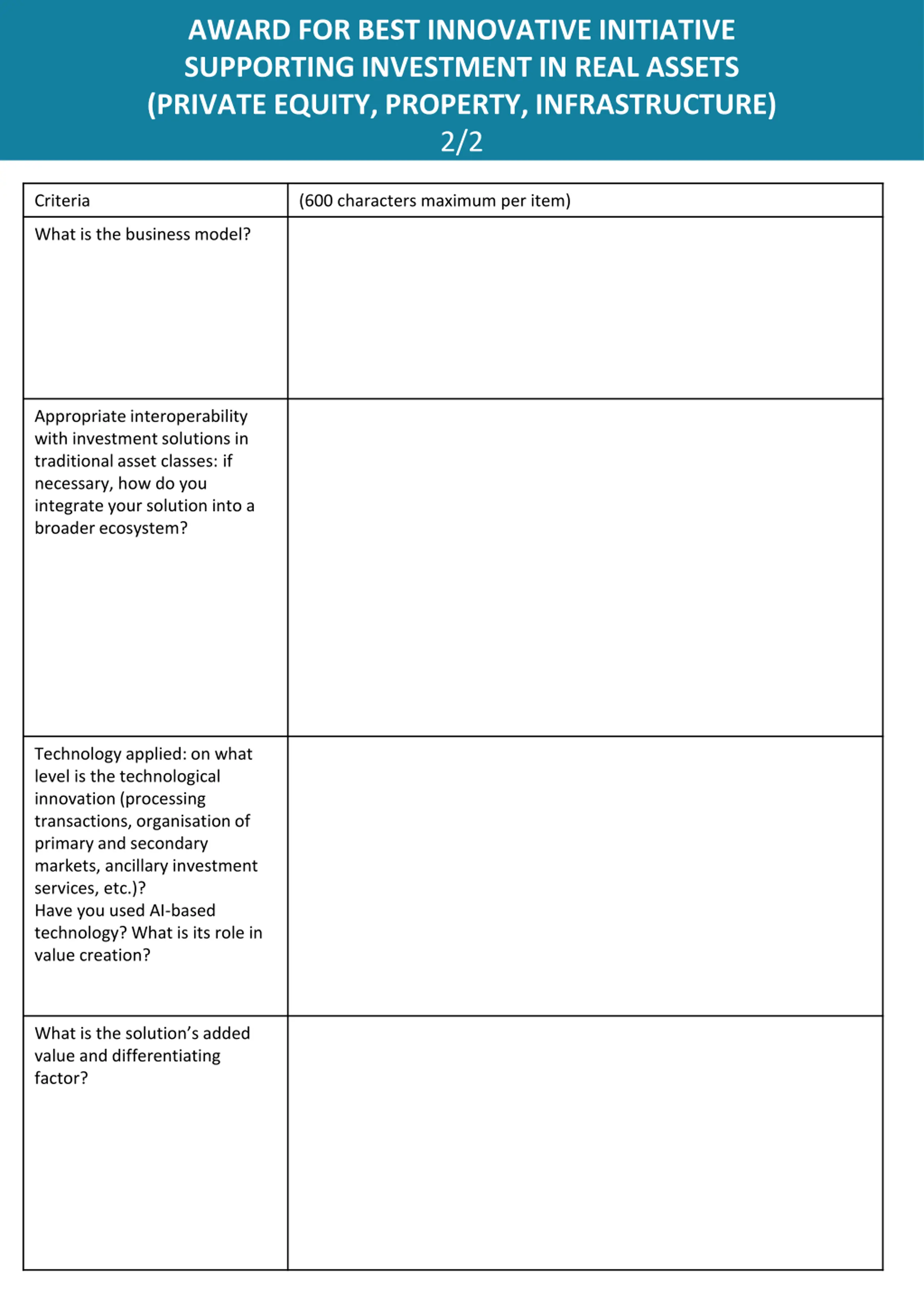 AWARD FOR BEST INNOVATIVE INITIATIVE SUPPORTING INVESTMENT IN REAL ASSETS (PRIVATE EQUITY, PROPERTY, INFRASTRUCTURE) 2/2 Criteria (600 characters maximum per item) What is the business model? Appropriate interoperability with investment solutions in traditional asset classes: if necessary, how do you integrate your solution into a broader ecosystem? Technology applied: on what level is the technological innovation (processing transactions, organisation of primary and secondary markets, ancillary investment services, etc.)? Have you used AI-based technology? What is its role in value creation? What is the solution s added value and differentiating factor?