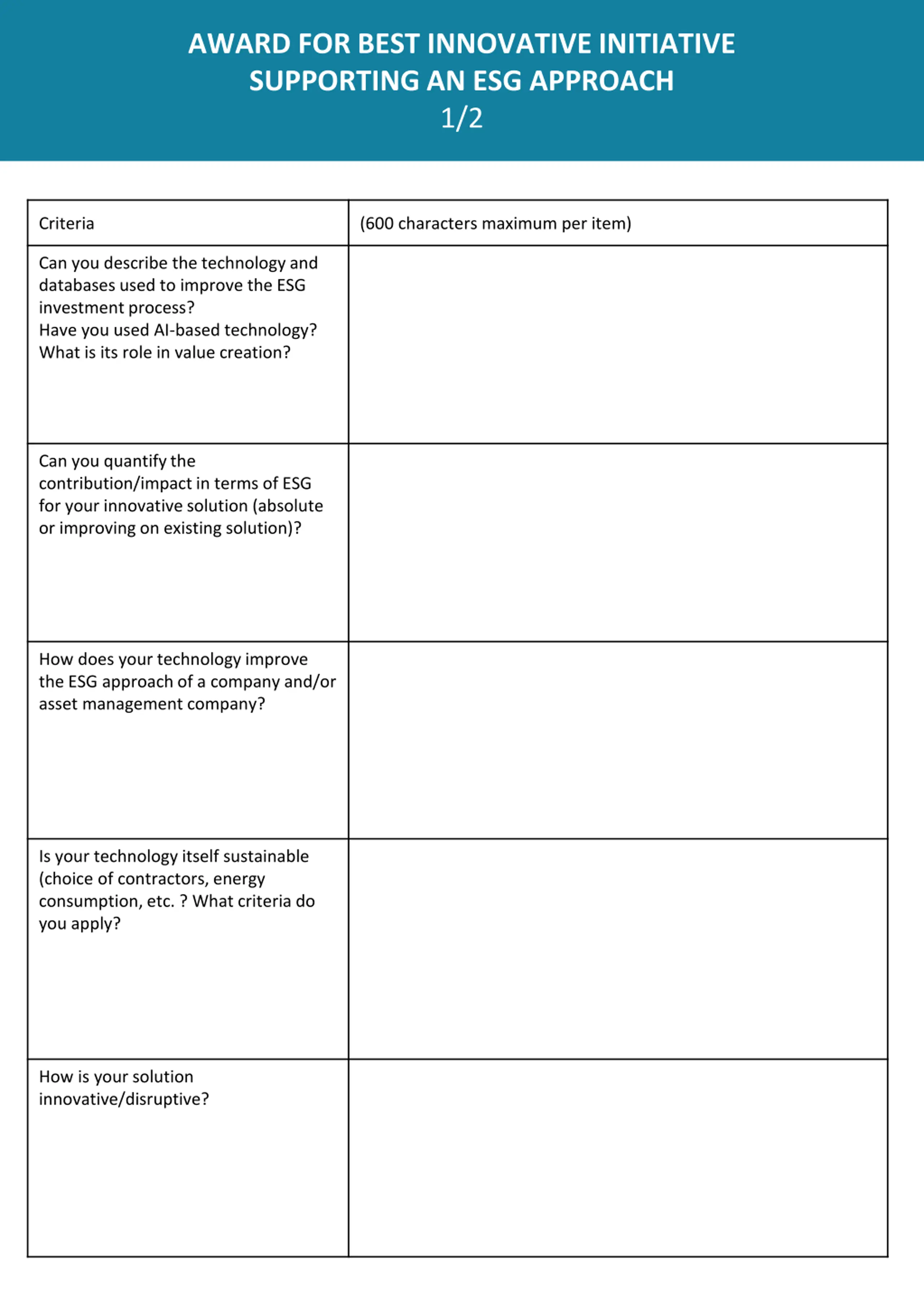 AWARD FOR BEST INNOVATIVE INITIATIVE SUPPORTING AN ESG APPROACH 1/2 Criteria (600 characters maximum per item) Can you describe the technology and databases used to improve the ESG investment process? Have you used AI-based technology? What is its role in value creation? Can you quantify the contribution/impact in terms of ESG for your innovative solution (absolute or improving on existing solution)? How does your technology improve the ESG approach of a company and/or asset management company? Is your technology itself sustainable (choice of contractors, energy consumption, etc. ? What criteria do you apply? How is your solution innovative/disruptive?