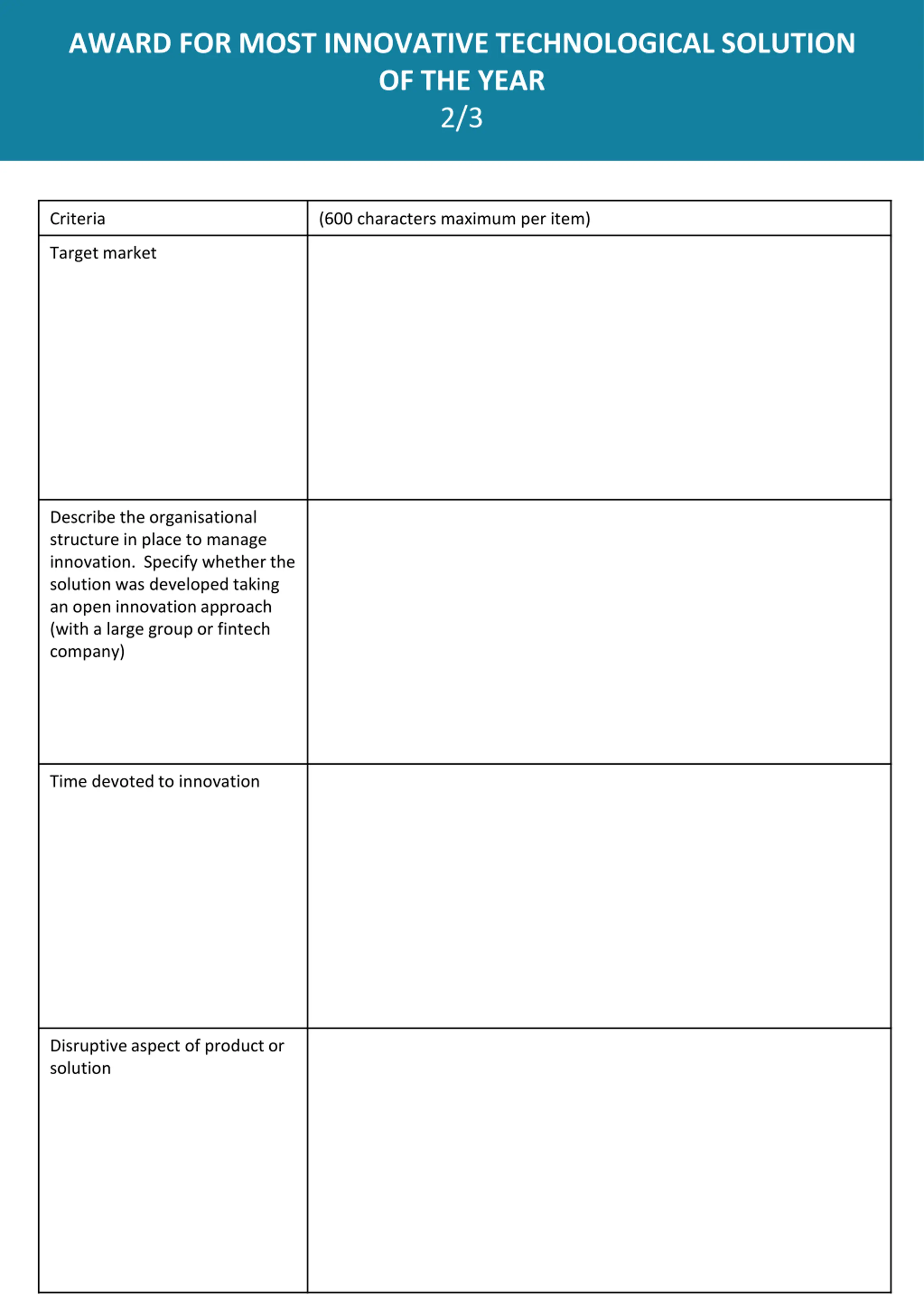 AWARD FOR MOST INNOVATIVE TECHNOLOGICAL SOLUTION OF THE YEAR 2/3 Criteria (600 characters maximum per item) Target market Describe the organisational structure in place to manage innovation. Specify whether the solution was developed taking an open innovation approach (with a large group or fintech company) Time devoted to innovation Disruptive aspect of product or solution
