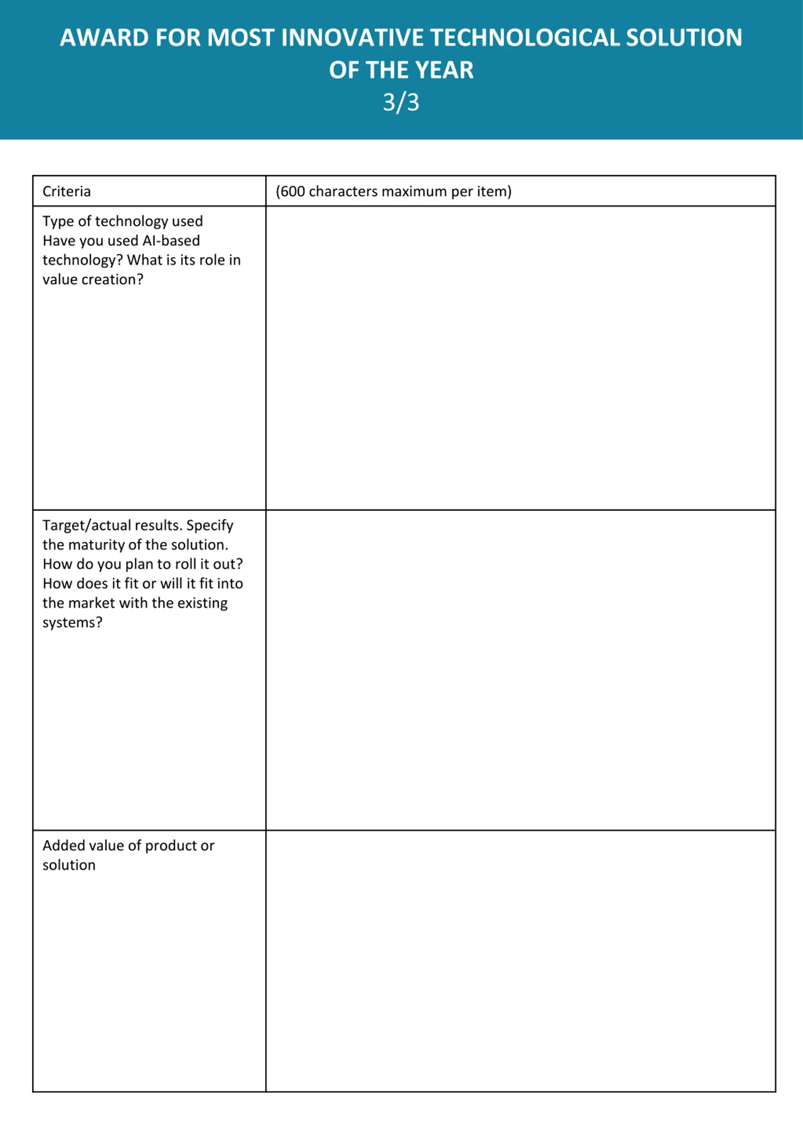 AWARD FOR MOST INNOVATIVE TECHNOLOGICAL SOLUTION OF THE YEAR 3/3 Criteria (600 characters maximum per item) Type of technology used Have you used AI-based technology? What is its role in value creation? Target/actual results. Specify the maturity of the solution. How do you plan to roll it out? How does it fit or will it fit into the market with the existing systems? Added value of product or solution