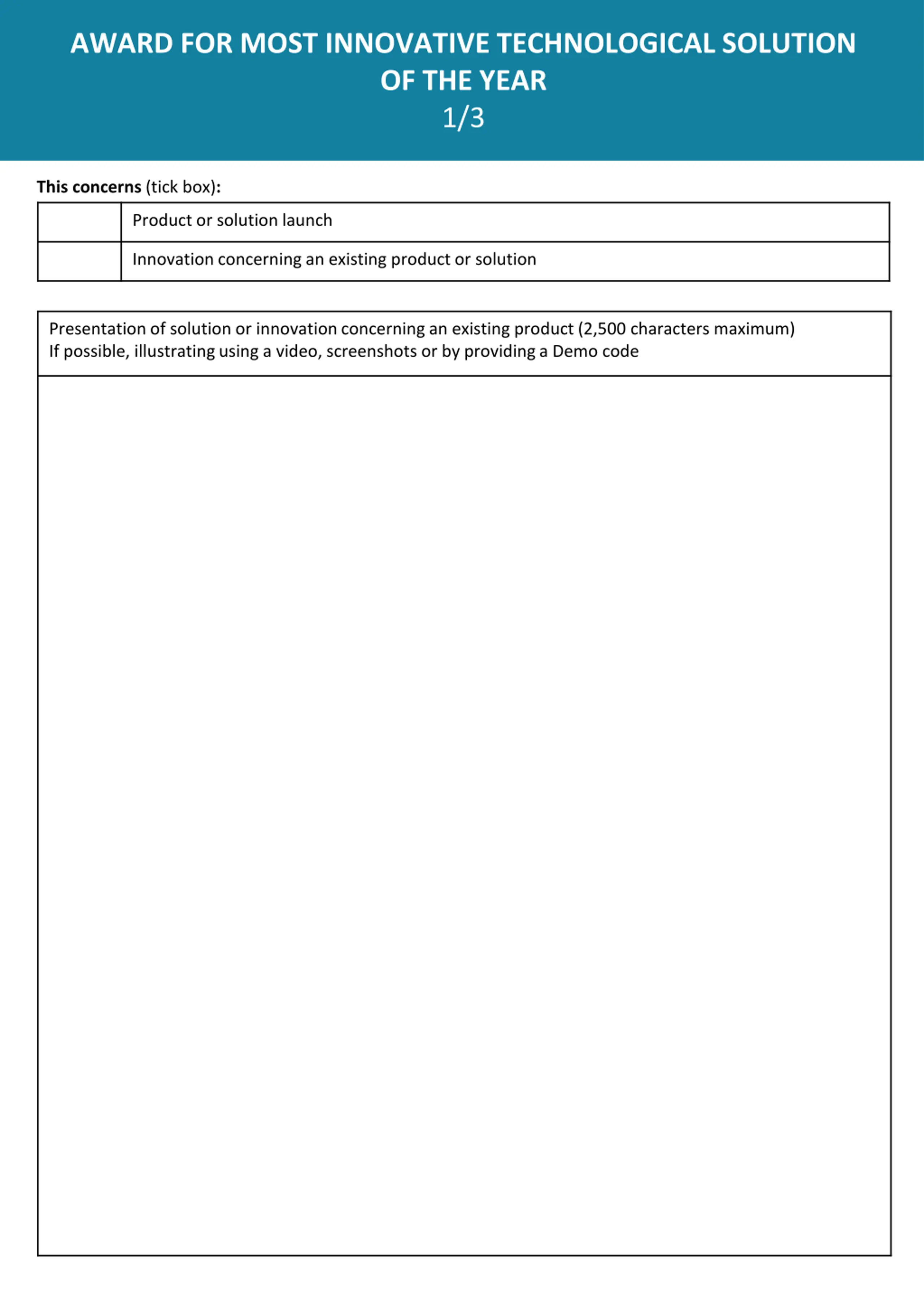 AWARD FOR MOST INNOVATIVE TECHNOLOGICAL SOLUTION OF THE YEAR 1/3 This concerns (tick box): Product or solution launch Innovation concerning an existing product or solution Presentation of solution or innovation concerning an existing product (2,500 characters maximum) If possible, illustrating using a video, screenshots or by providing a Demo code