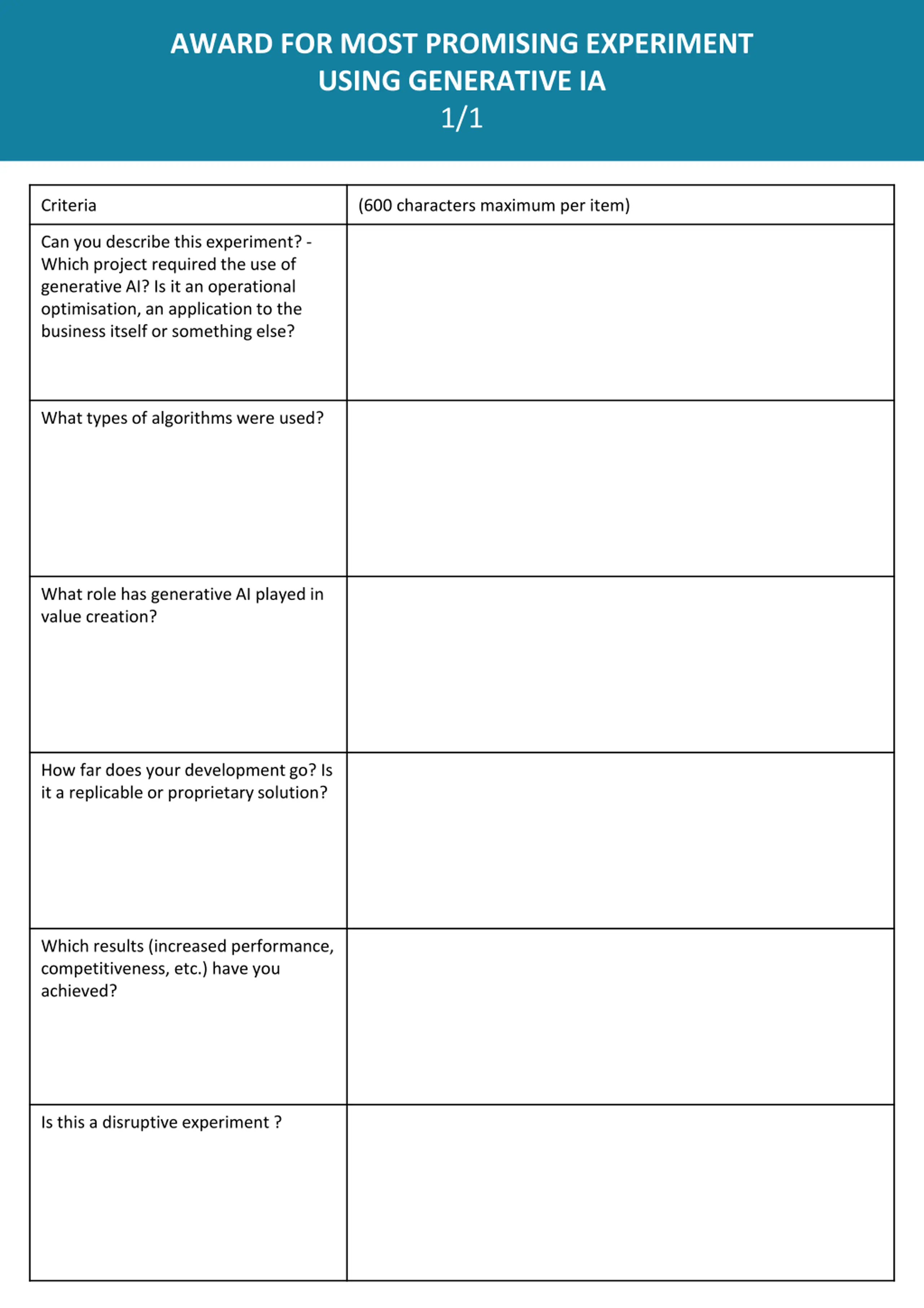 AWARD FOR MOST PROMISING EXPERIMENT USING GENERATIVE IA 1/1 Criteria (600 characters maximum per item) Can you describe this experiment? - Which project required the use of generative AI? Is it an operational optimisation, an application to the business itself or something else? What types of algorithms were used? What role has generative AI played in value creation? How far does your development go? Is it a replicable or proprietary solution? Which results (increased performance, competitiveness, etc.) have you achieved? Is this a disruptive experiment ?