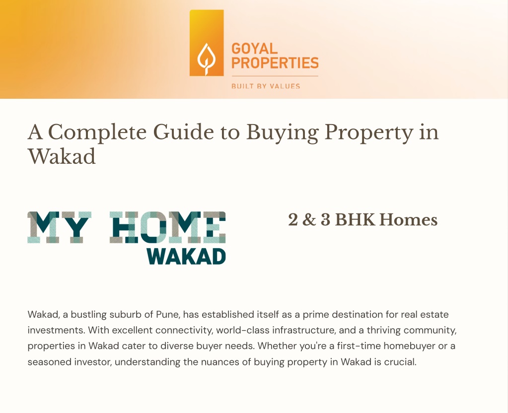 How to Make a Successful Property Purchase in Wakad Research and Property Visits Start by researching online to shortlist properties that meet your criteria. Use platforms to explore projects like my home Punawale or Punawale projects. Schedule site visits to firsthand assess the property's quality, location, and surroundings. 1 Negotiating with Builders 2 When negotiating, inquire about discounts, payment plans, and additional benefits. Trusted developers like Goyal Properties are often open to discussions, ensuring a win-win deal. Hiring Experts 3 Real estate agents, legal advisors, and financial consultants can make the buying process smoother. Their expertise ensures you don't overlook important details, saving time and money.