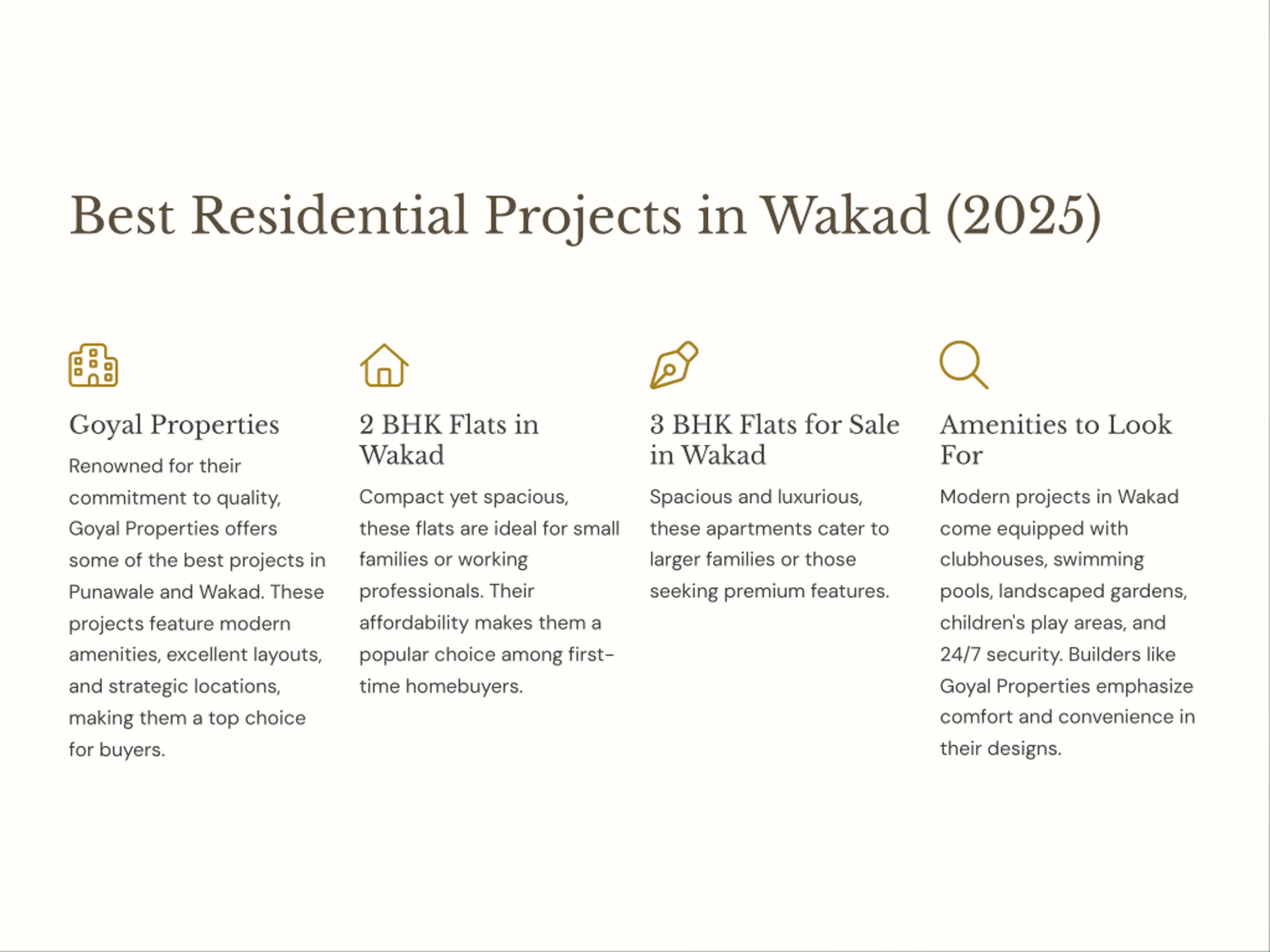 Best Residential Projects in Wakad (2025) Goyal Properties 2 BHK Flats in Wakad 3 BHK Flats for Sale in Wakad Amenities to Look For Renowned for their commitment to quality, Goyal Properties offers some of the best projects in Punawale and Wakad. These projects feature modern amenities, excellent layouts, and strategic locations, making them a top choice for buyers. Compact yet spacious, these flats are ideal for small families or working professionals. Their affordability makes them a popular choice among first- time homebuyers. Spacious and luxurious, these apartments cater to larger families or those seeking premium features. Modern projects in Wakad come equipped with clubhouses, swimming pools, landscaped gardens, children's play areas, and 24/7 security. Builders like Goyal Properties emphasize comfort and convenience in their designs.