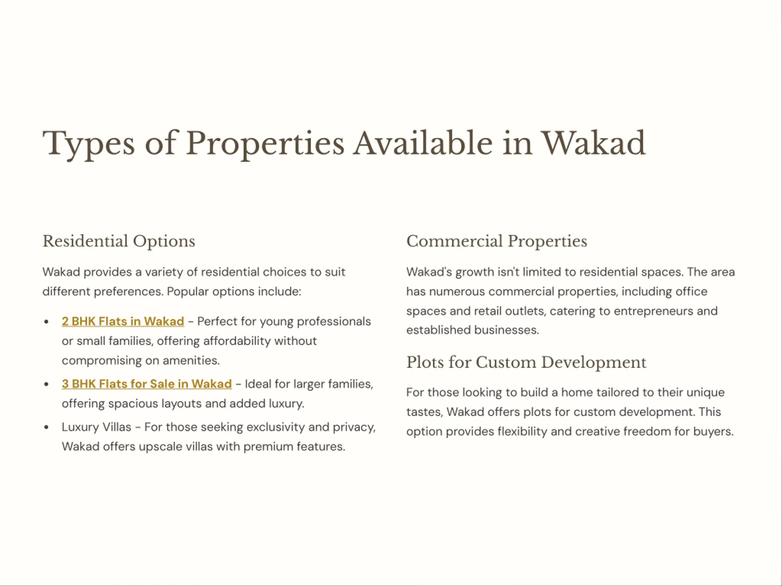 Types of Properties Available in Wakad Residential Options Commercial Properties Wakad provides a variety of residential choices to suit different preferences. Popular options include: Wakad's growth isn't limited to residential spaces. The area has numerous commercial properties, including office spaces and retail outlets, catering to entrepreneurs and established businesses. 2 BHK Flats in Wakad - Perfect for young professionals or small families, offering affordability without compromising on amenities. Plots for Custom Development 3 BHK Flats for Sale in Wakad - Ideal for larger families, offering spacious layouts and added luxury. For those looking to build a home tailored to their unique tastes, Wakad offers plots for custom development. This option provides flexibility and creative freedom for buyers. Luxury Villas - For those seeking exclusivity and privacy, Wakad offers upscale villas with premium features.