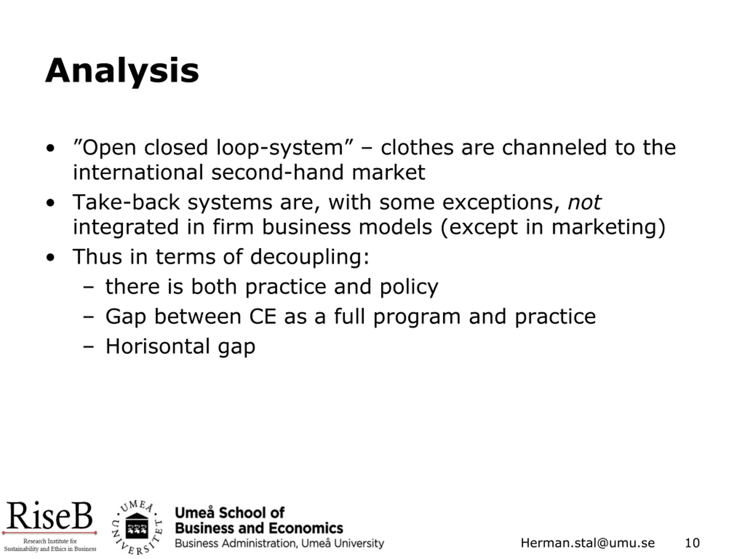 Analysis Open closed loop-system clothes are channeled to the international second-hand market Take-back systems are, with some exceptions, not integrated in firm business models (except in marketing) Thus in terms of decoupling: there is both practice and policy Gap between CE as a full program and practice Horisontal gap Herman.stal@umu.se 10