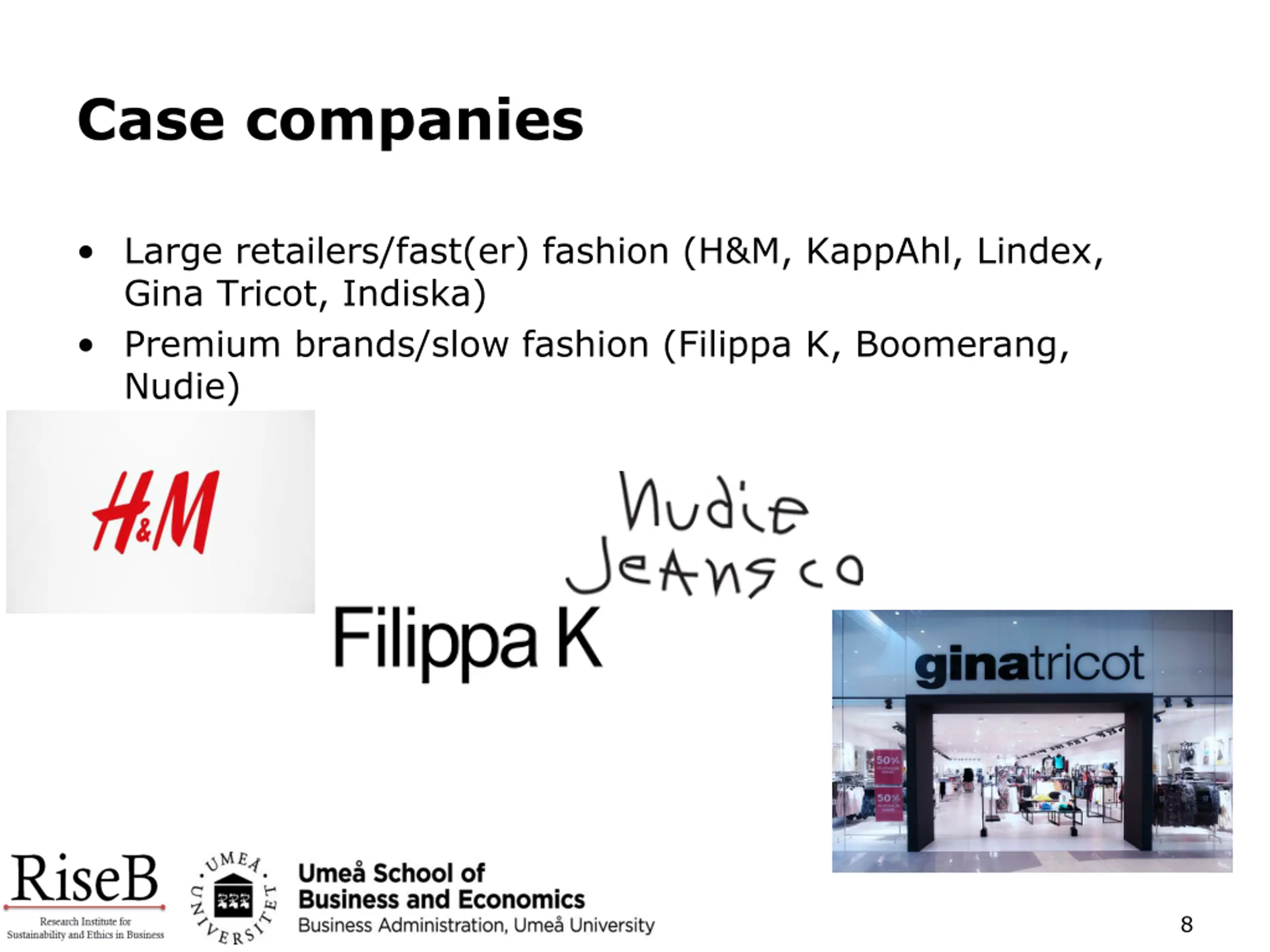Case companies Large retailers/fast(er) fashion (H&M, KappAhl, Lindex, Gina Tricot, Indiska) Premium brands/slow fashion (Filippa K, Boomerang, Nudie) 8
