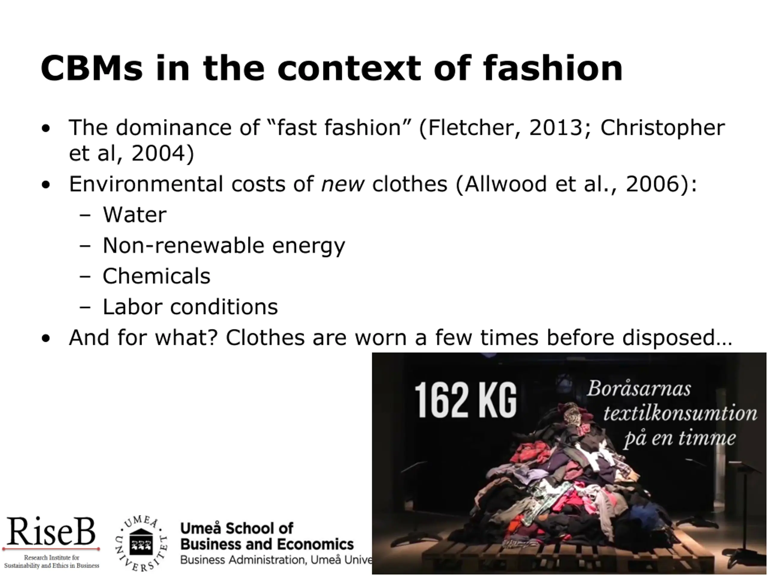 CBMs in the context of fashion The dominance of fast fashion (Fletcher, 2013; Christopher et al, 2004) Environmental costs of new clothes (Allwood et al., 2006): Water Non-renewable energy Chemicals Labor conditions And for what? Clothes are worn a few times before disposed 7