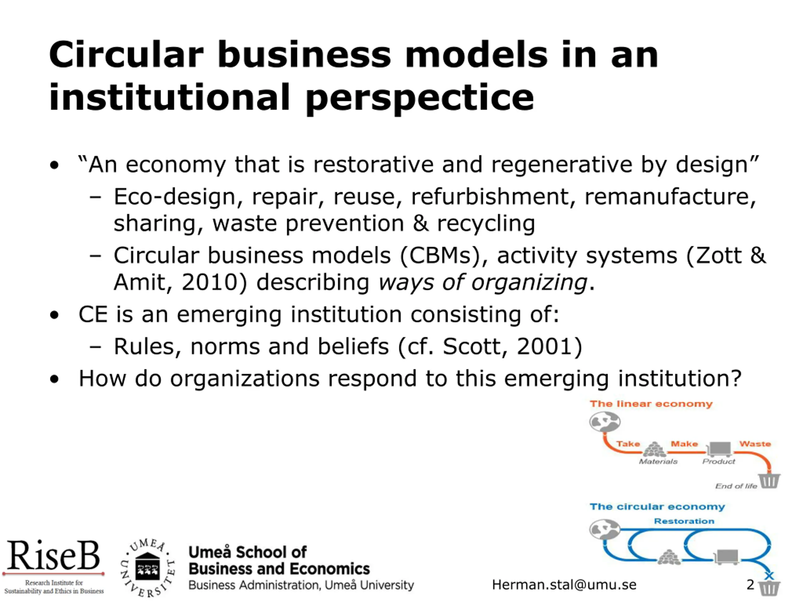 Circular business models in an institutional perspectice An economy that is restorative and regenerative by design Eco-design, repair, reuse, refurbishment, remanufacture, sharing, waste prevention & recycling Circular business models (CBMs), activity systems (Zott & Amit, 2010) describing ways of organizing. CE is an emerging institution consisting of: Rules, norms and beliefs (cf. Scott, 2001) How do organizations respond to this emerging institution? Herman.stal@umu.se 2
