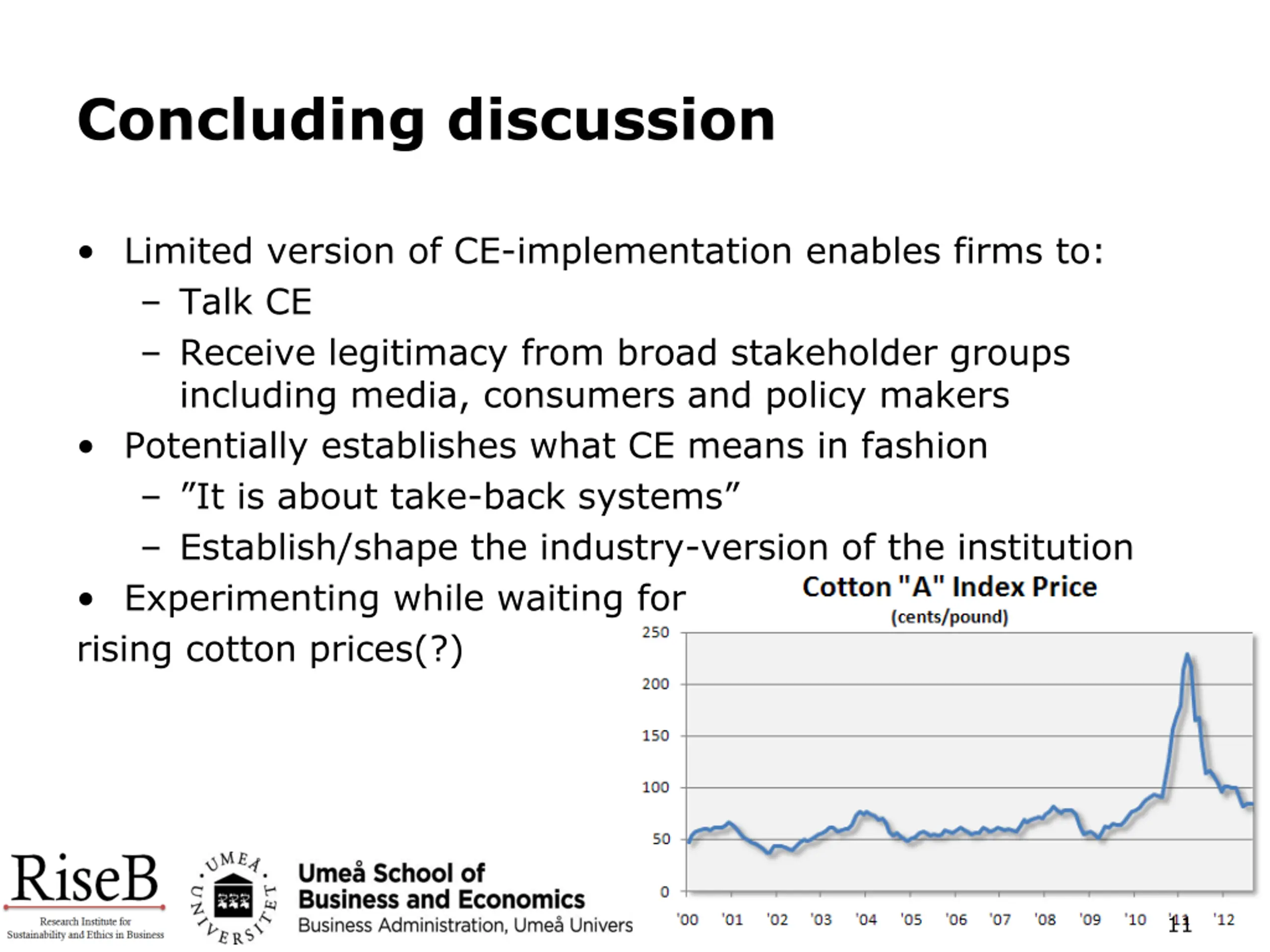 Concluding discussion Limited version of CE-implementation enables firms to: Talk CE Receive legitimacy from broad stakeholder groups including media, consumers and policy makers Potentially establishes what CE means in fashion It is about take-back systems Establish/shape the industry-version of the institution Experimenting while waiting for rising cotton prices(?) 11