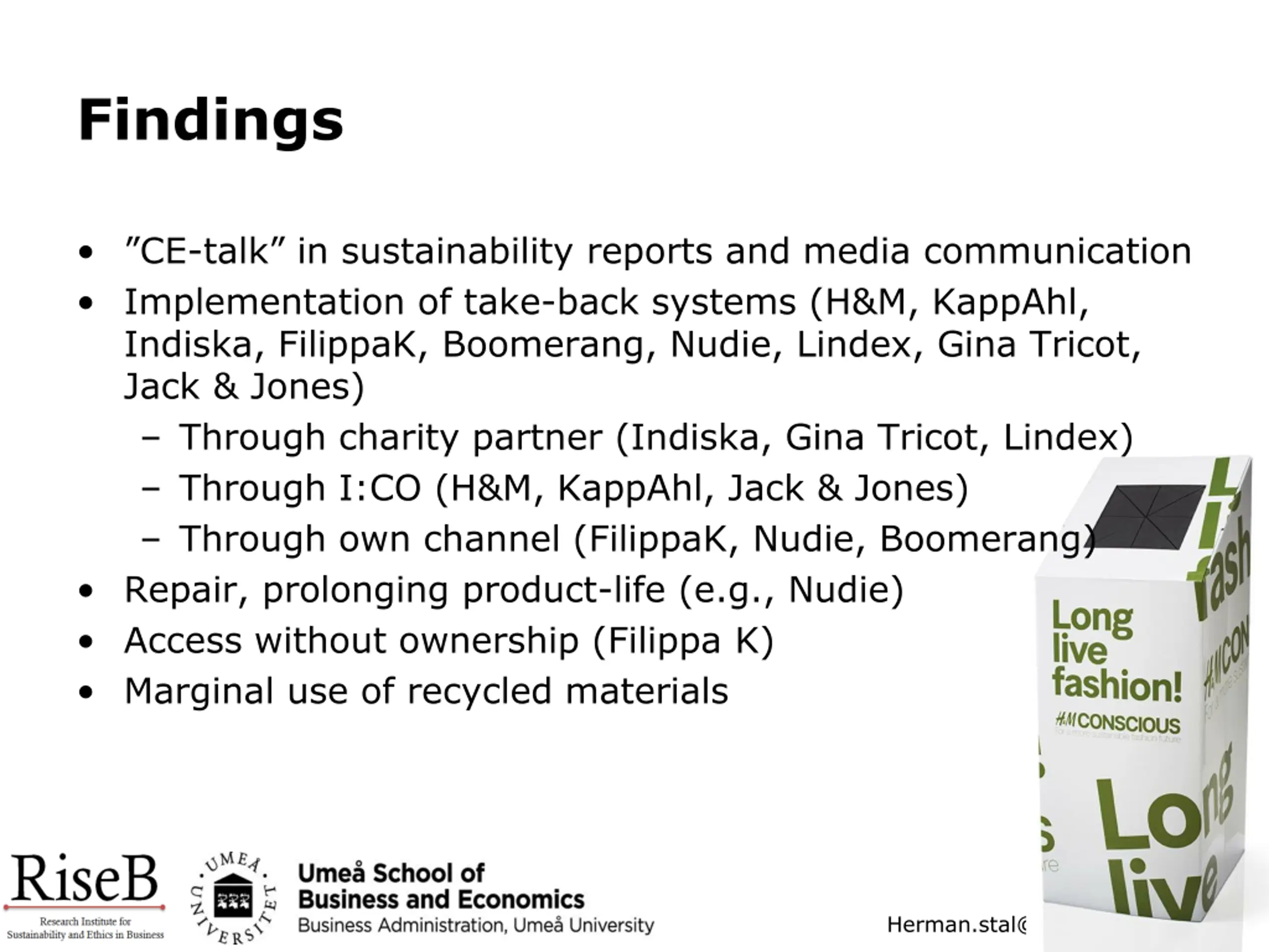 Findings CE-talk in sustainability reports and media communication Implementation of take-back systems (H&M, KappAhl, Indiska, FilippaK, Boomerang, Nudie, Lindex, Gina Tricot, Jack & Jones) Through charity partner (Indiska, Gina Tricot, Lindex) Through I:CO (H&M, KappAhl, Jack & Jones) Through own channel (FilippaK, Nudie, Boomerang) Repair, prolonging product-life (e.g., Nudie) Access without ownership (Filippa K) Marginal use of recycled materials Herman.stal@umu.se 9