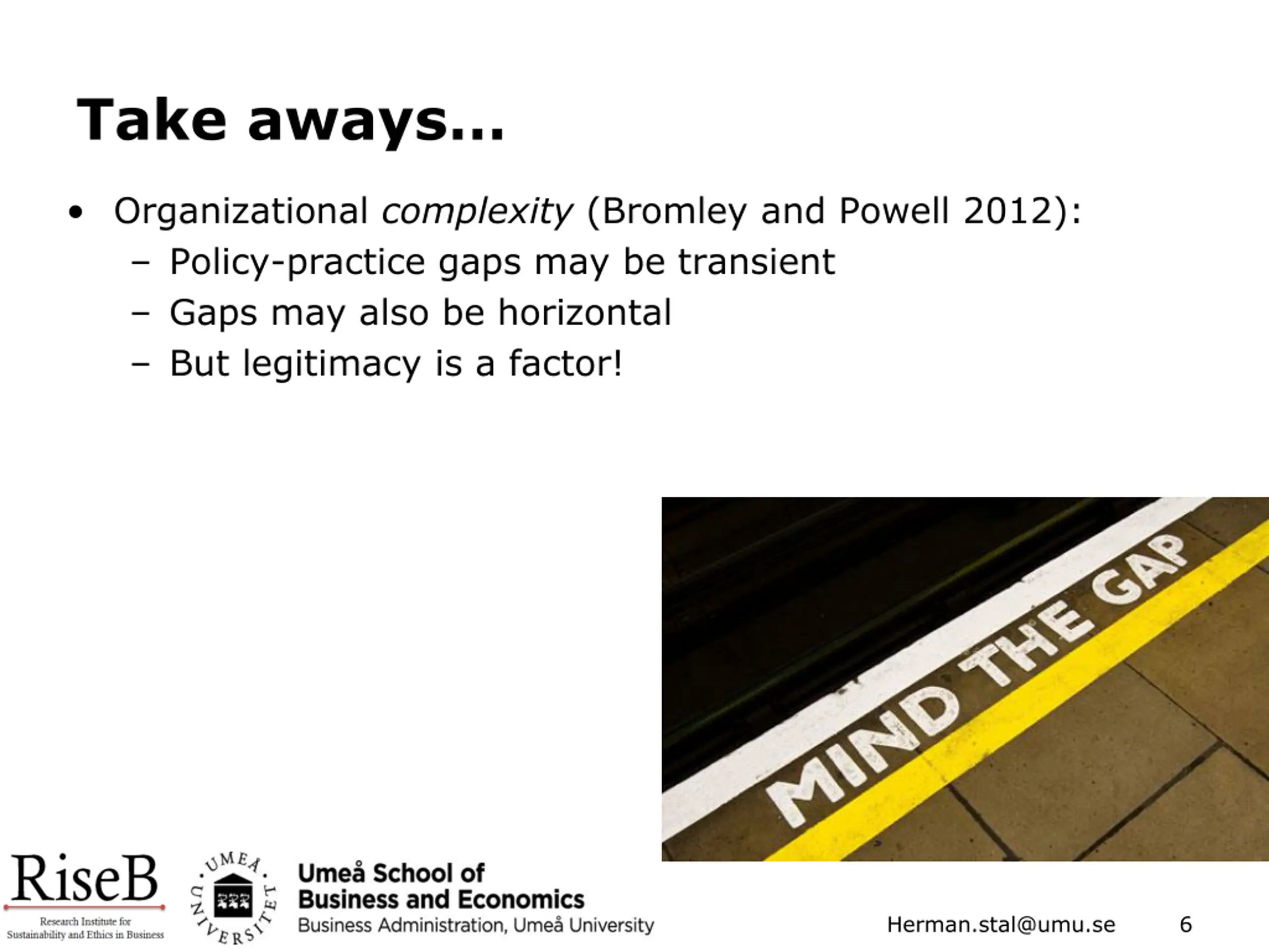 Take aways Organizational complexity (Bromley and Powell 2012): Policy-practice gaps may be transient Gaps may also be horizontal But legitimacy is a factor! Herman.stal@umu.se 6
