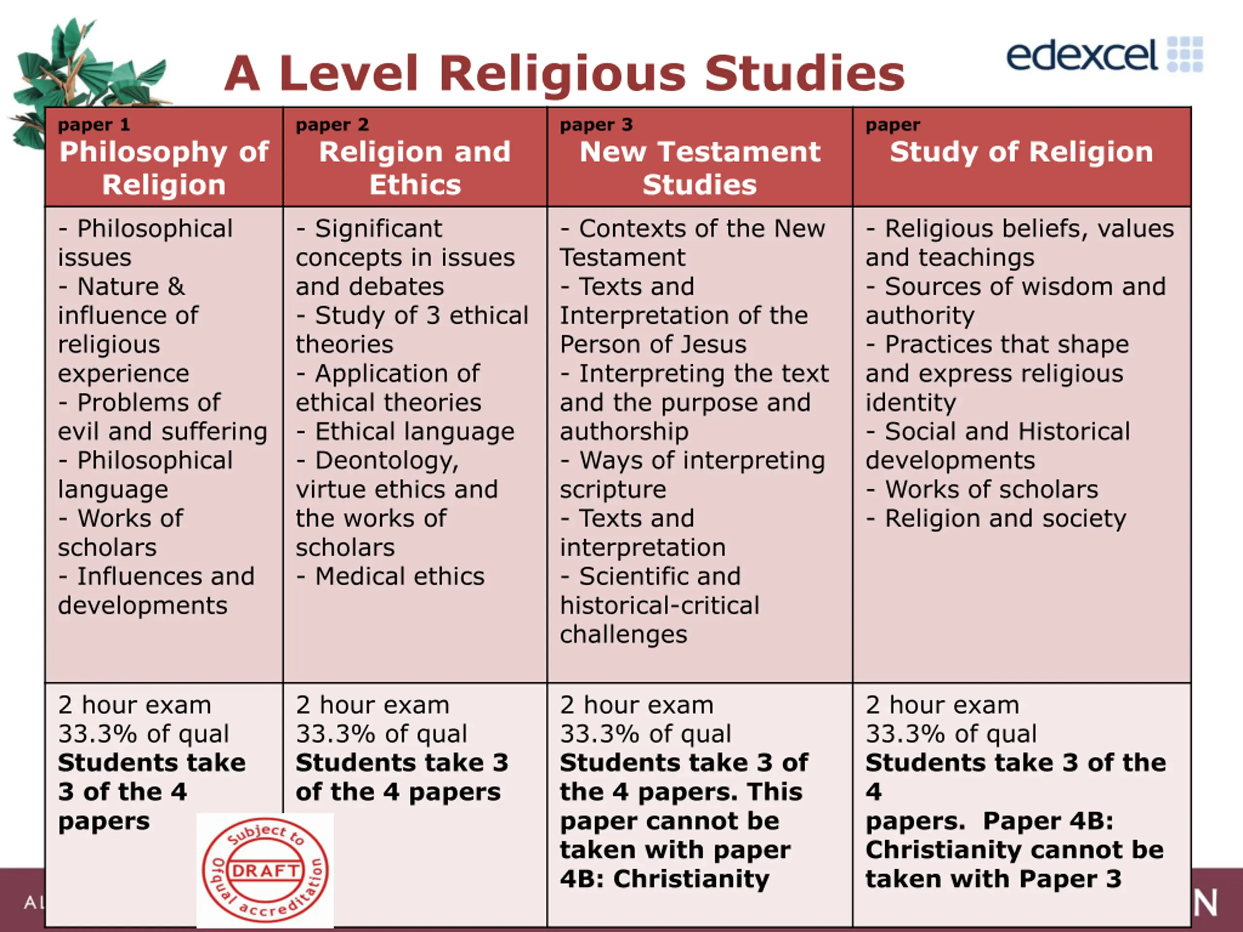 A Level Religious Studies paper 1 Philosophy of Religion - Philosophical issues - Nature & influence of religious experience - Problems of evil and suffering - Philosophical language - Works of scholars - Influences and developments paper 2 Religion and Ethics - Significant concepts in issues and debates - Study of 3 ethical theories - Application of ethical theories - Ethical language - Deontology, virtue ethics and the works of scholars - Medical ethics paper 3 New Testament Studies - Contexts of the New Testament - Texts and Interpretation of the Person of Jesus - Interpreting the text and the purpose and authorship - Ways of interpreting scripture - Texts and interpretation - Scientific and historical-critical challenges paper Study of Religion - Religious beliefs, values and teachings - Sources of wisdom and authority - Practices that shape and express religious identity - Social and Historical developments - Works of scholars - Religion and society 2 hour exam 33.3% of qual Students take 3 of the 4 papers 2 hour exam 33.3% of qual Students take 3 of the 4 papers 2 hour exam 33.3% of qual Students take 3 of the 4 papers. This paper cannot be taken with paper 4B: Christianity 2 hour exam 33.3% of qual Students take 3 of the 4 papers. Paper 4B: Christianity cannot be taken with Paper 3