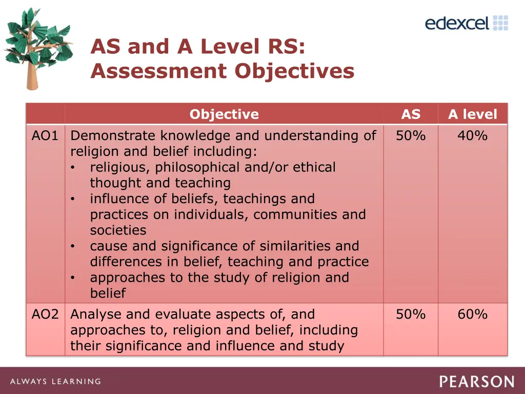 AS and A Level RS: Assessment Objectives Objective AS 50% A level 40% AO1 Demonstrate knowledge and understanding of religion and belief including: religious, philosophical and/or ethical thought and teaching influence of beliefs, teachings and practices on individuals, communities and societies cause and significance of similarities and differences in belief, teaching and practice approaches to the study of religion and belief AO2 Analyse and evaluate aspects of, and approaches to, religion and belief, including their significance and influence and study 50% 60%