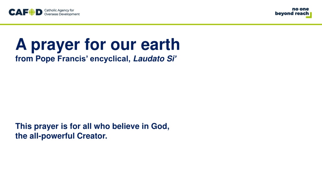 A prayer for our earth from Pope Francis encyclical, Laudato Si This prayer is for all who believe in God, the all-powerful Creator.