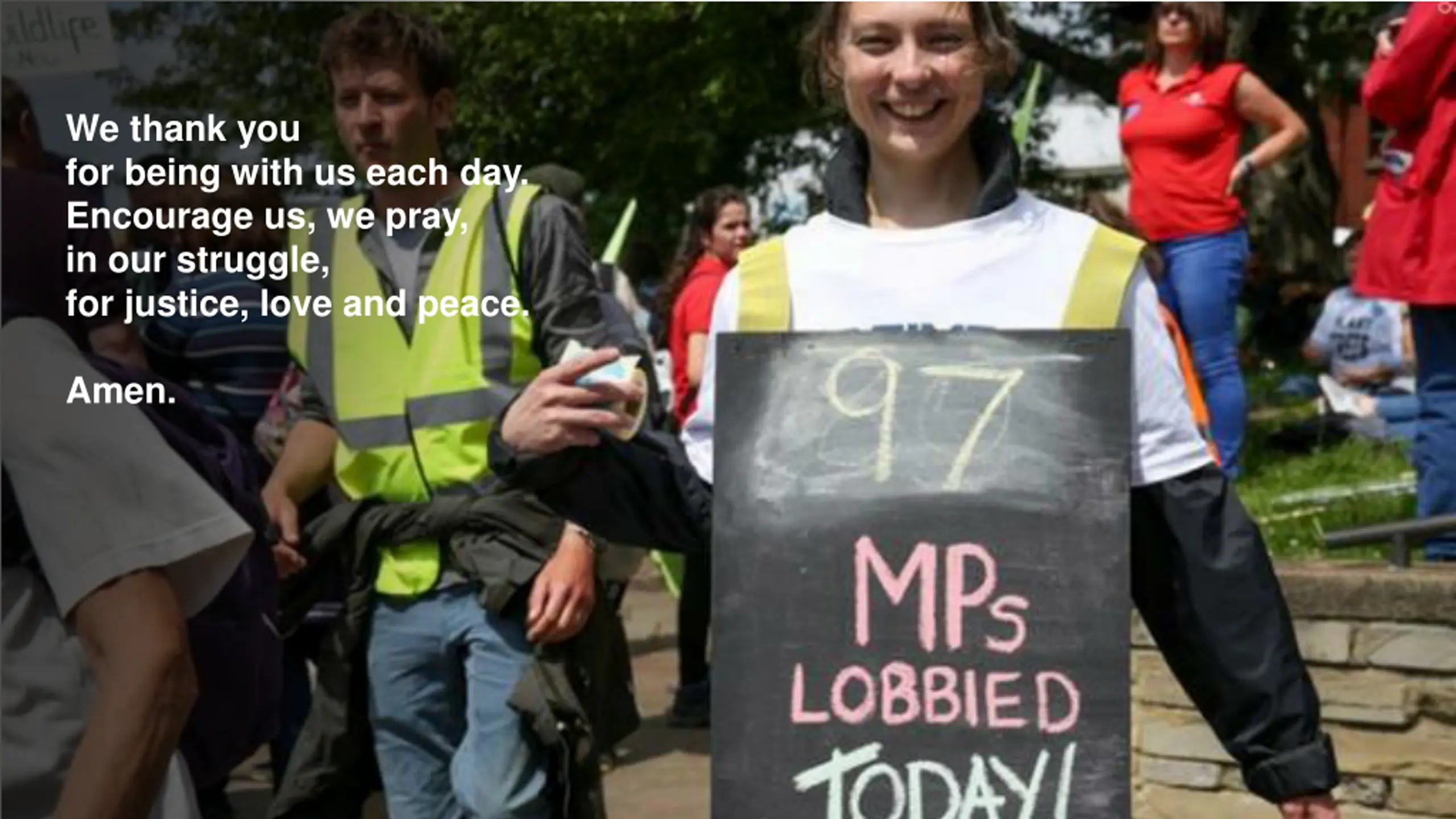 We thank you for being with us each day. Encourage us, we pray, in our struggle, for justice, love and peace. Amen.
