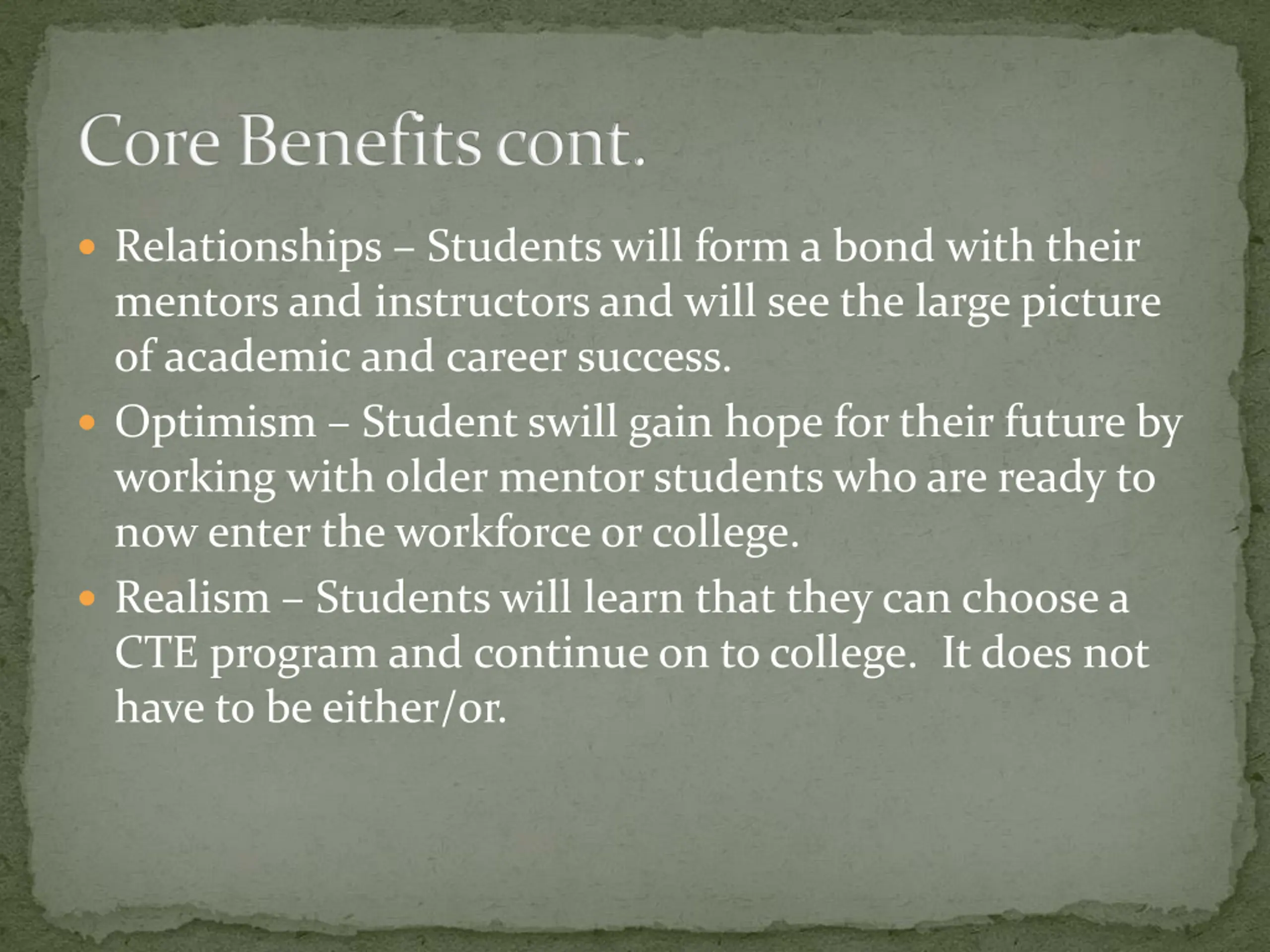 Core Benefits cont. Relationships Students will form a bond with their mentors and instructors and will see the large picture of academic and career success. Optimism Student swill gain hope for their future by working with older mentor students who are ready to now enter the workforce or college. Realism Students will learn that they can choose a CTE program and continue on to college. It does not have to be either/or.