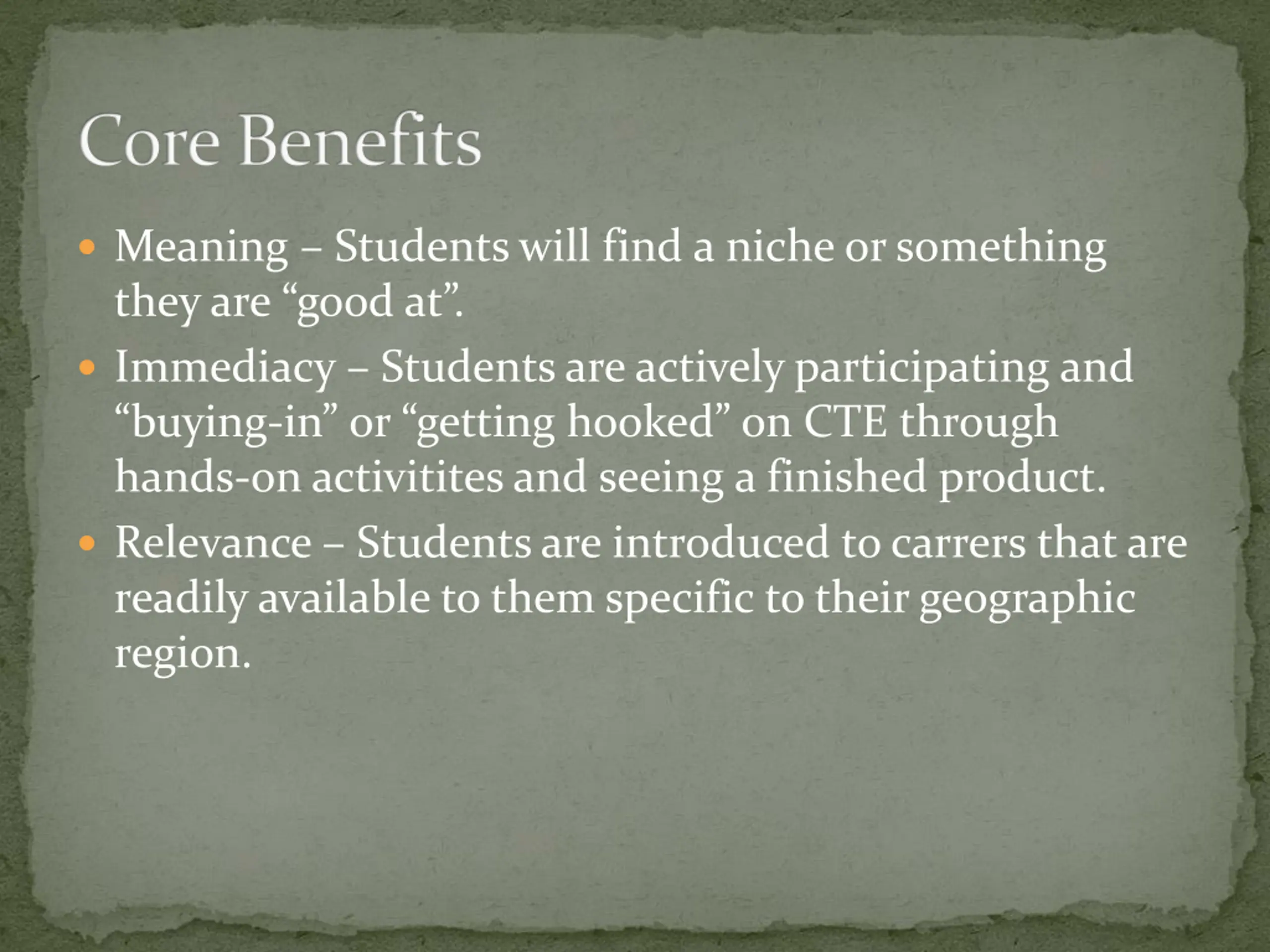 Core Benefits Meaning Students will find a niche or something they are good at . Immediacy Students are actively participating and buying-in or getting hooked on CTE through hands-on activititesand seeing a finished product. Relevance Students are introduced to carrers that are readily available to them specific to their geographic region.