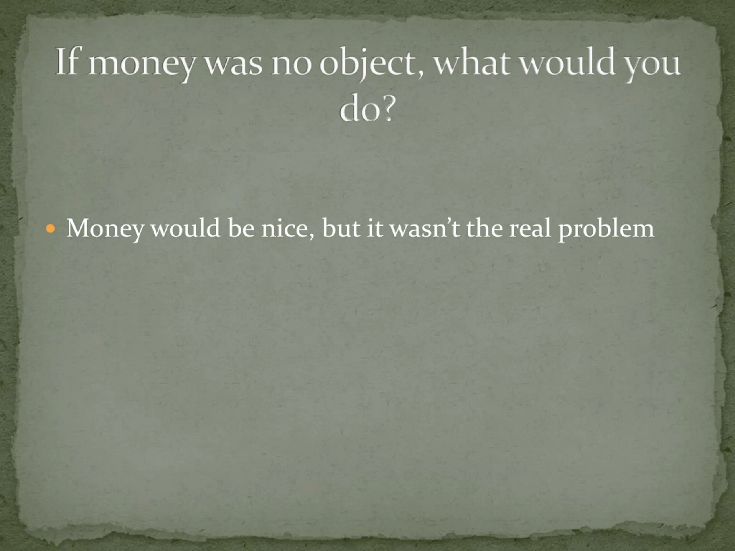 If money was no object, what would you do? Money would be nice, but it wasn t the real problem