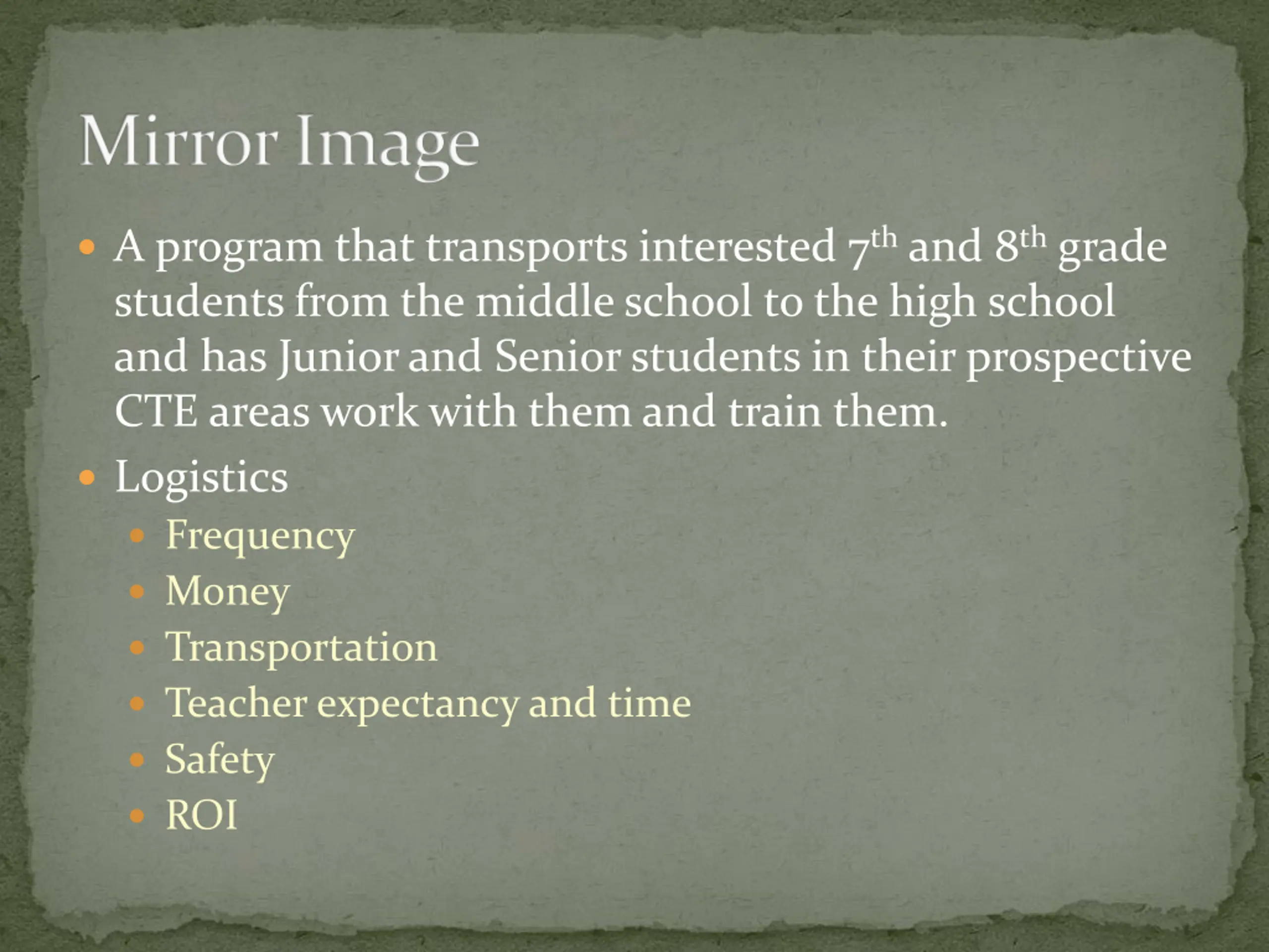 Mirror Image A program that transports interested 7thand 8thgrade students from the middle school to the high school and has Junior and Senior students in their prospective CTE areas work with them and train them. Logistics Frequency Money Transportation Teacher expectancy and time Safety ROI