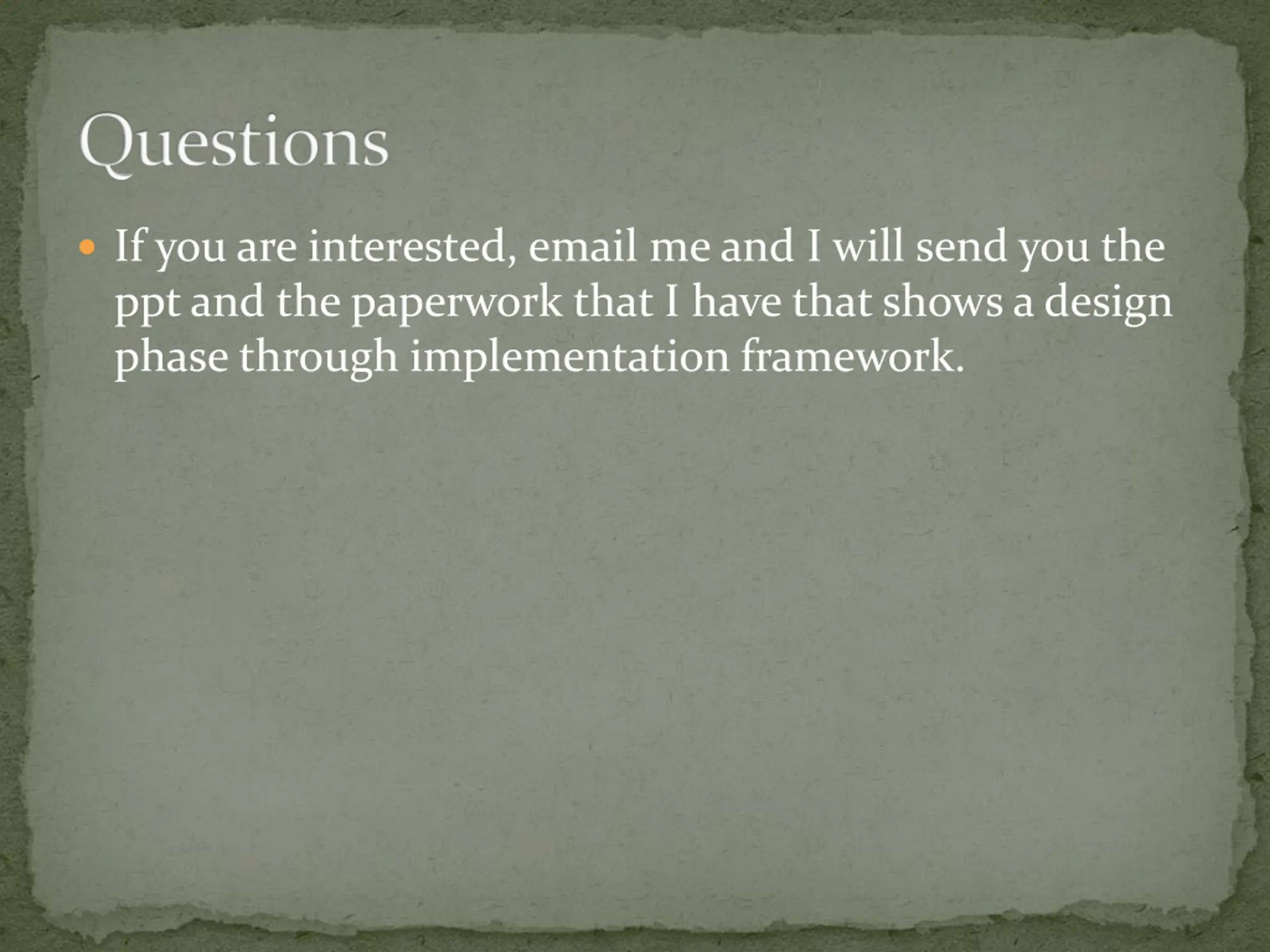 Questions If you are interested, email me and I will send you the pptand the paperwork that I have that shows a design phase through implementation framework.