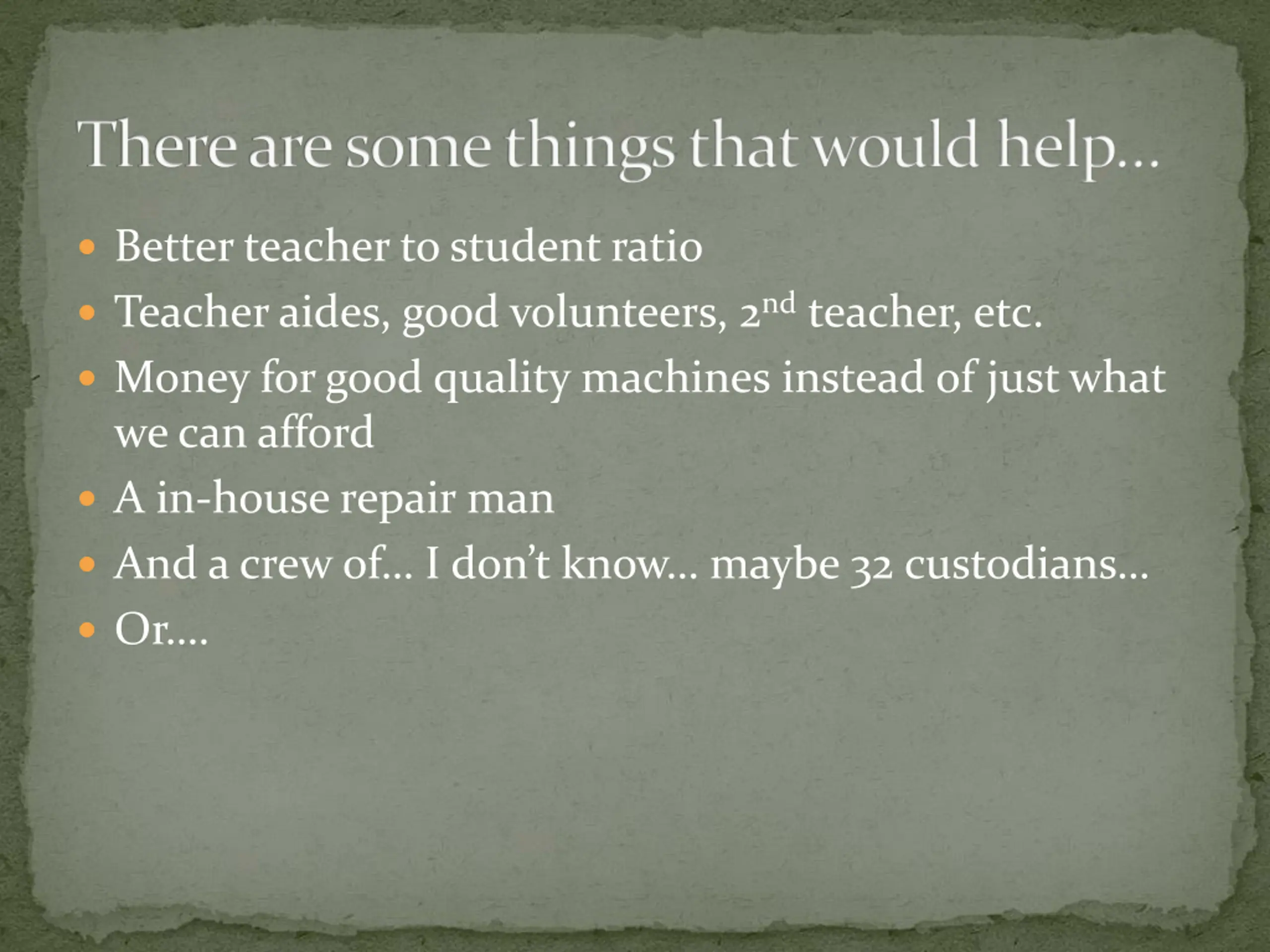There are some things that would help Better teacher to student ratio Teacher aides, good volunteers, 2ndteacher, etc. Money for good quality machines instead of just what we can afford A in-house repair man And a crew of I don t know maybe 32 custodians Or .