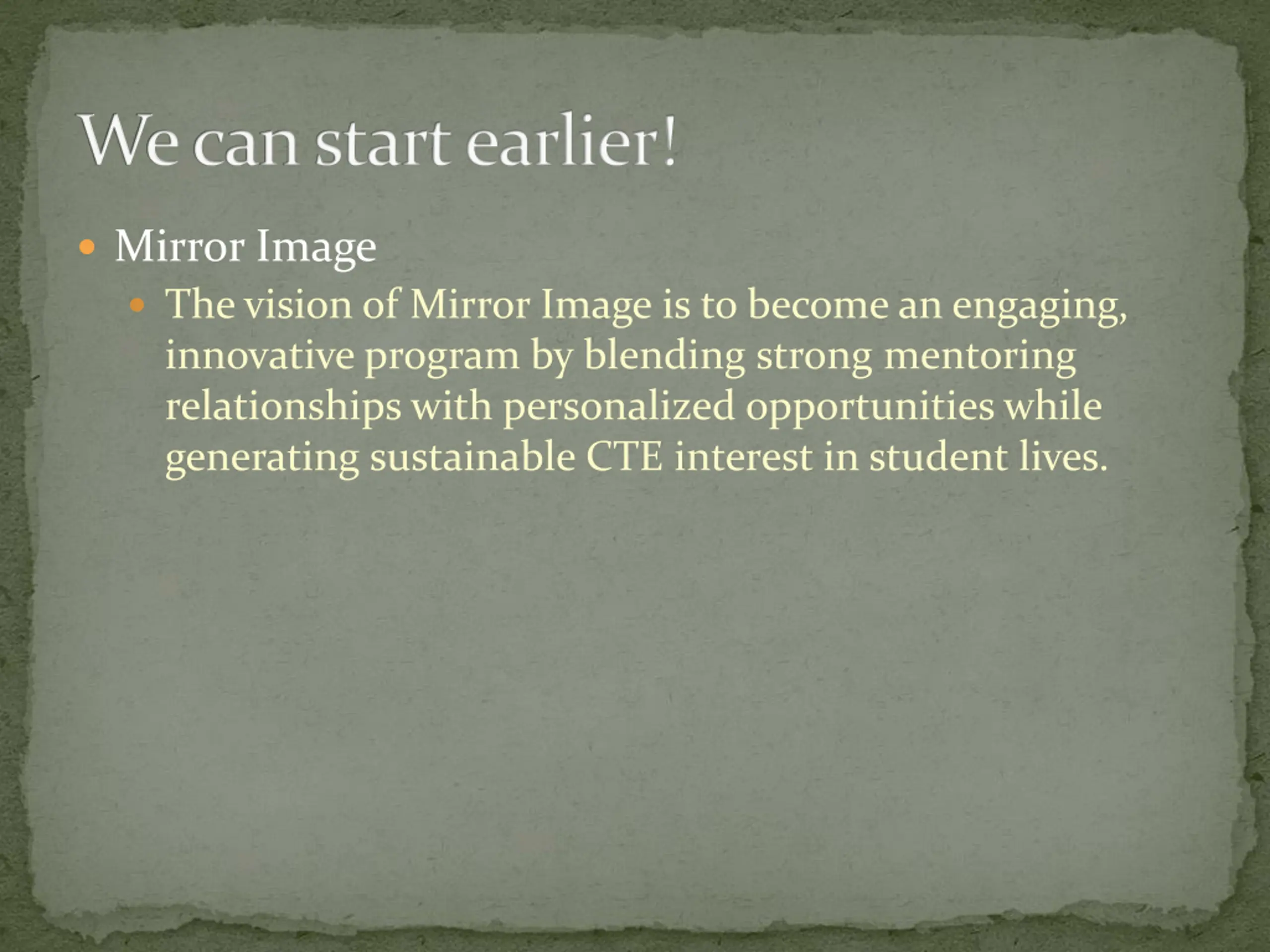 We can start earlier! Mirror Image The vision of Mirror Image is to become an engaging, innovative program by blending strong mentoring relationships with personalized opportunities while generating sustainable CTE interest in student lives.