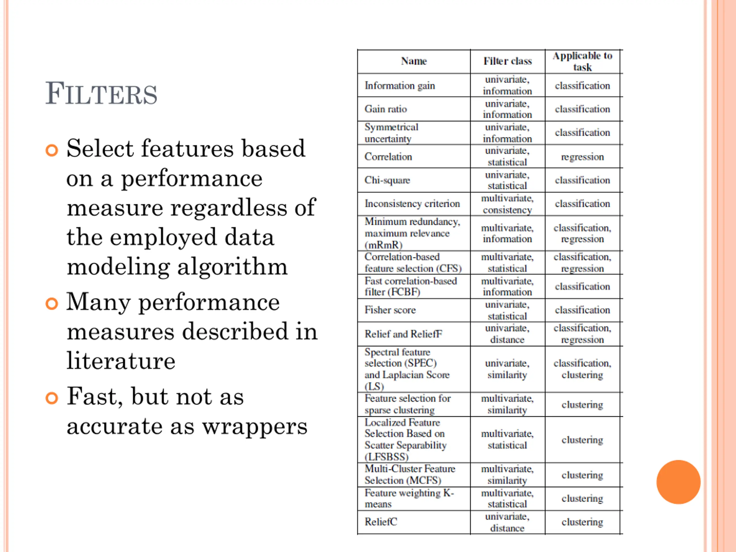 FILTERS Select features based on a performance measure regardless of the employed data modeling algorithm Many performance measures described in literature Fast, but not as accurate as wrappers