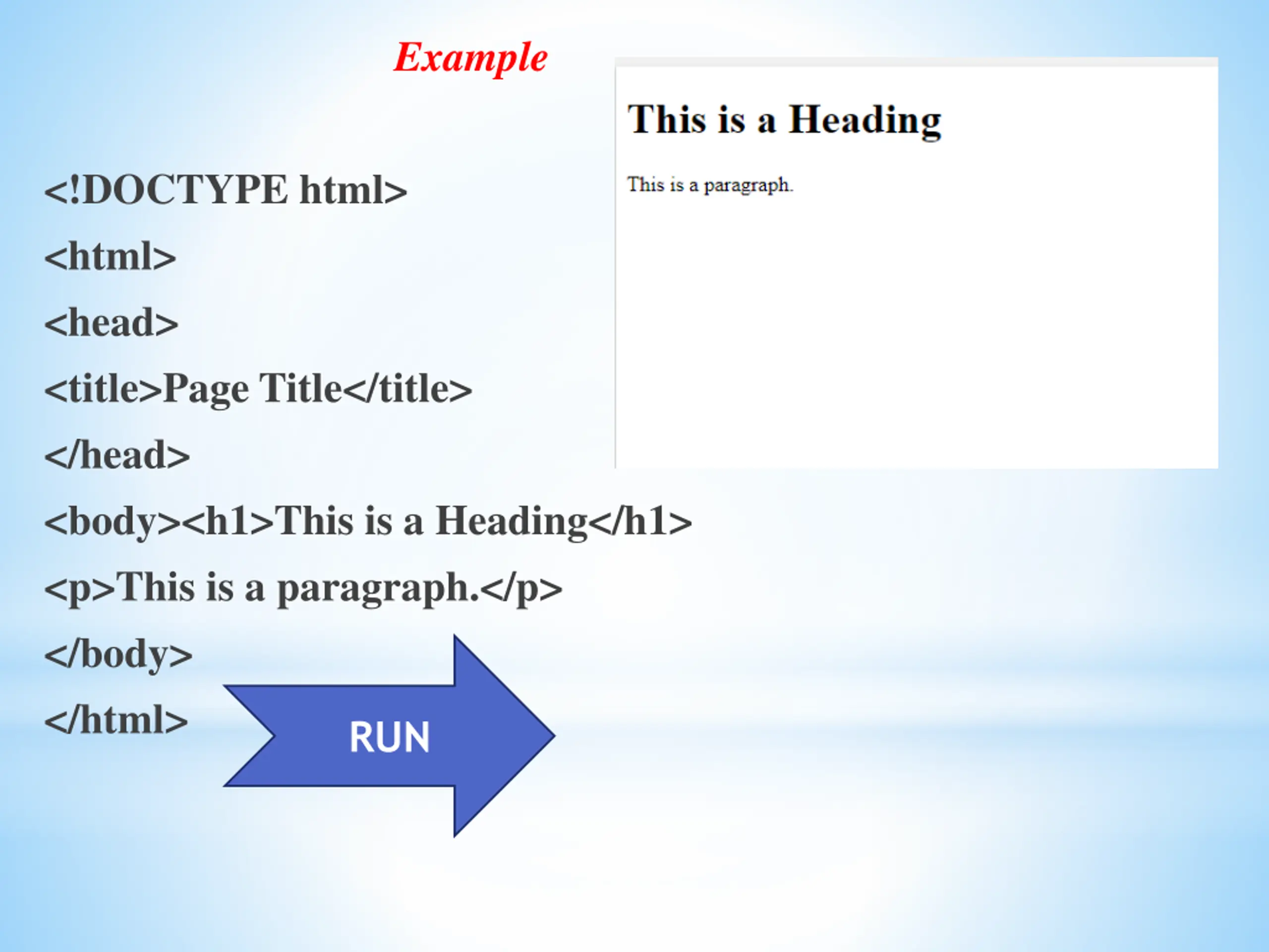 Example <!DOCTYPE html> <html> <head> <title>Page Title</title> </head> <body><h1>This is a Heading</h1> <p>This is a paragraph.</p> </body> </html> RUN