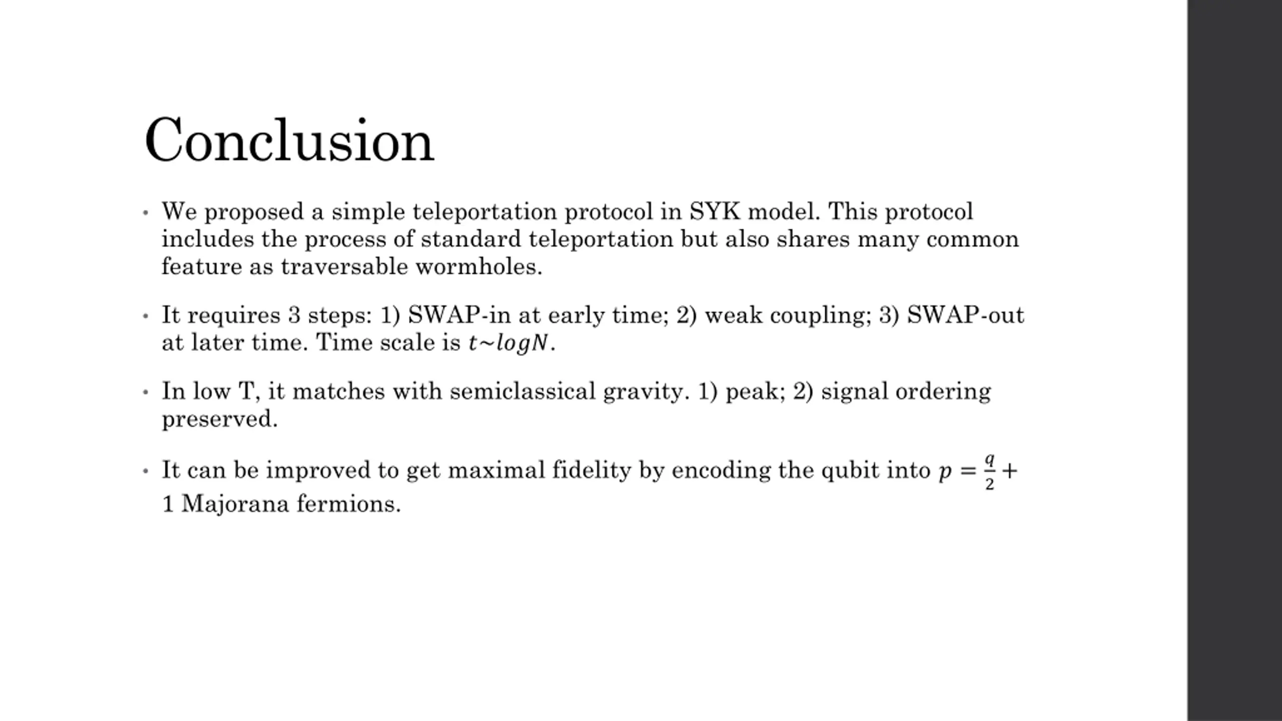 Conclusion We proposed a simple teleportation protocol in SYK model. This protocol includes the process of standard teleportation but also shares many common feature as traversable wormholes. It requires 3 steps: 1) SWAP-in at early time; 2) weak coupling; 3) SWAP-out at later time. Time scale is ?~????. In low T, it matches with semiclassical gravity. 1) peak; 2) signal ordering preserved. It can be improved to get maximal fidelity by encoding the qubit into ? =? 1 Majorana fermions. 2+