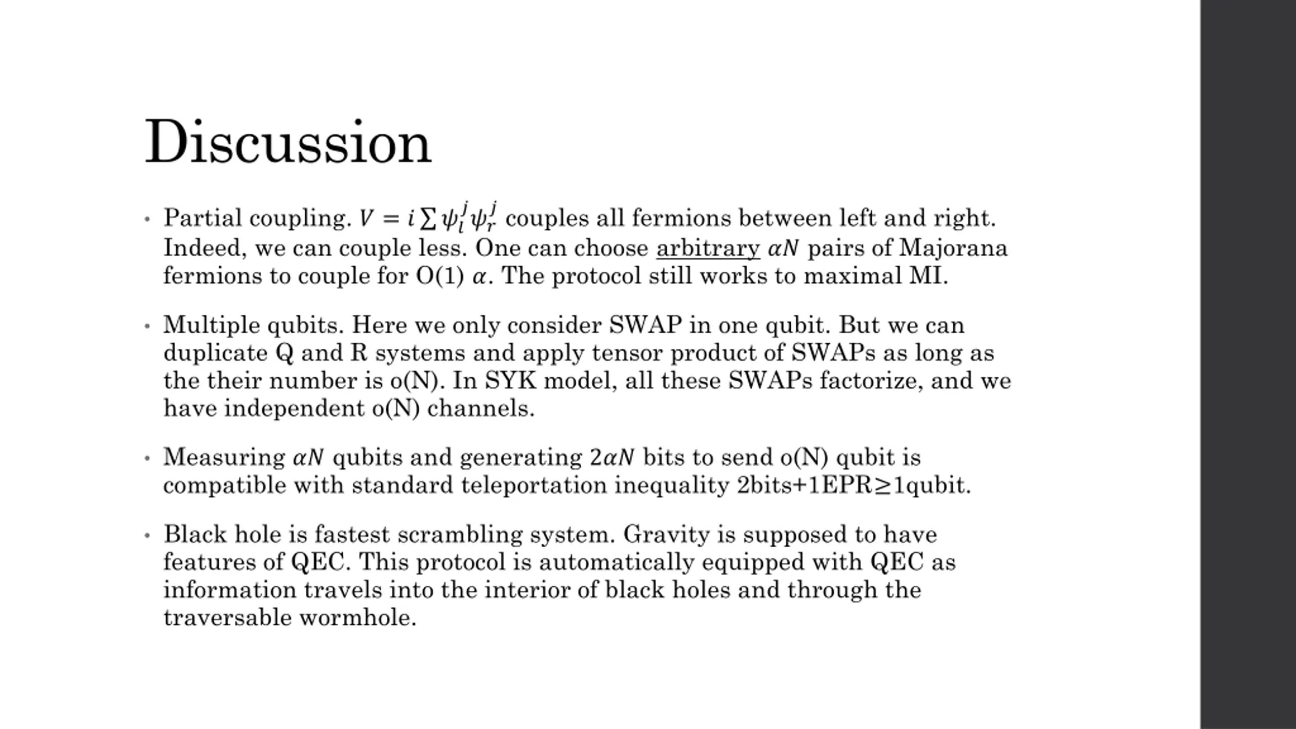 Discussion ??? ? couples all fermions between left and right. Partial coupling. ? = ? ?? Indeed, we can couple less. One can choose arbitrary ?? pairs of Majorana fermions to couple for O(1) ?. The protocol still works to maximal MI. Multiple qubits. Here we only consider SWAP in one qubit. But we can duplicate Q and R systems and apply tensor product of SWAPs as long as the their number is o(N). In SYK model, all these SWAPs factorize, and we have independent o(N) channels. Measuring ?? qubits and generating 2?? bits to send o(N) qubit is compatible with standard teleportation inequality 2bits+1EPR 1qubit. Black hole is fastest scrambling system. Gravity is supposed to have features of QEC. This protocol is automatically equipped with QEC as information travels into the interior of black holes and through the traversable wormhole.