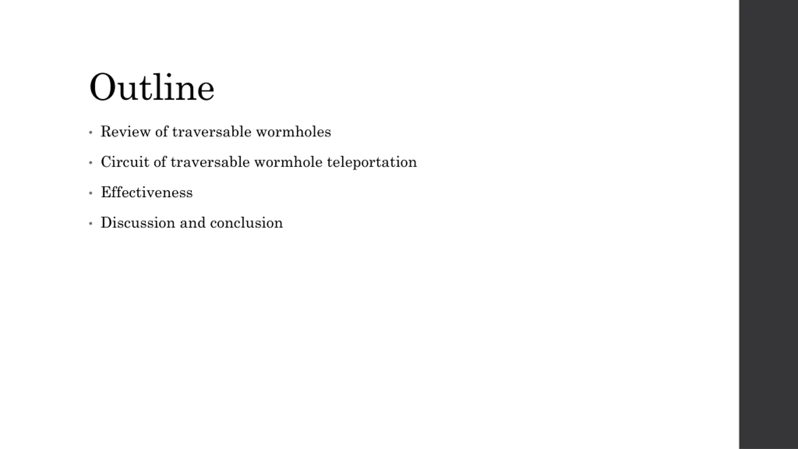 Outline Review of traversable wormholes Circuit of traversable wormhole teleportation Effectiveness Discussion and conclusion