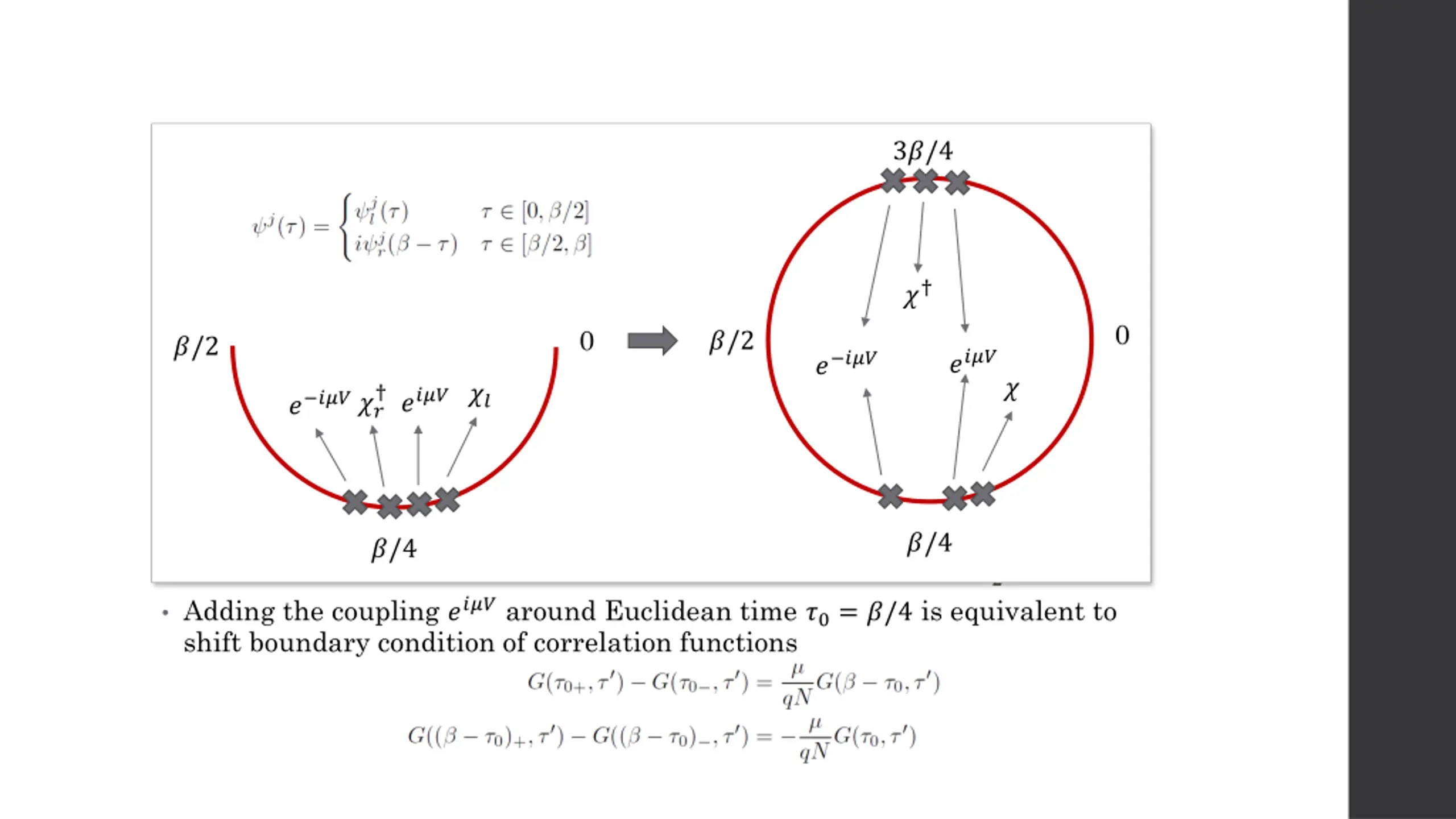 SYK model 3?/4 Use trick to define a stitching field and combine left and right fermions ? 0 0 ?/2 Define bilinear field G (its vev in TFD state is correlation of fermions) ?/2 ???? ? ??? ? ?? ???? ? ??? ?? Effective action is Large N limit. Equation of motion ?/4 ?/4 Adding the coupling ???? around Euclidean time ?0= ?/4 is equivalent to shift boundary condition of correlation functions