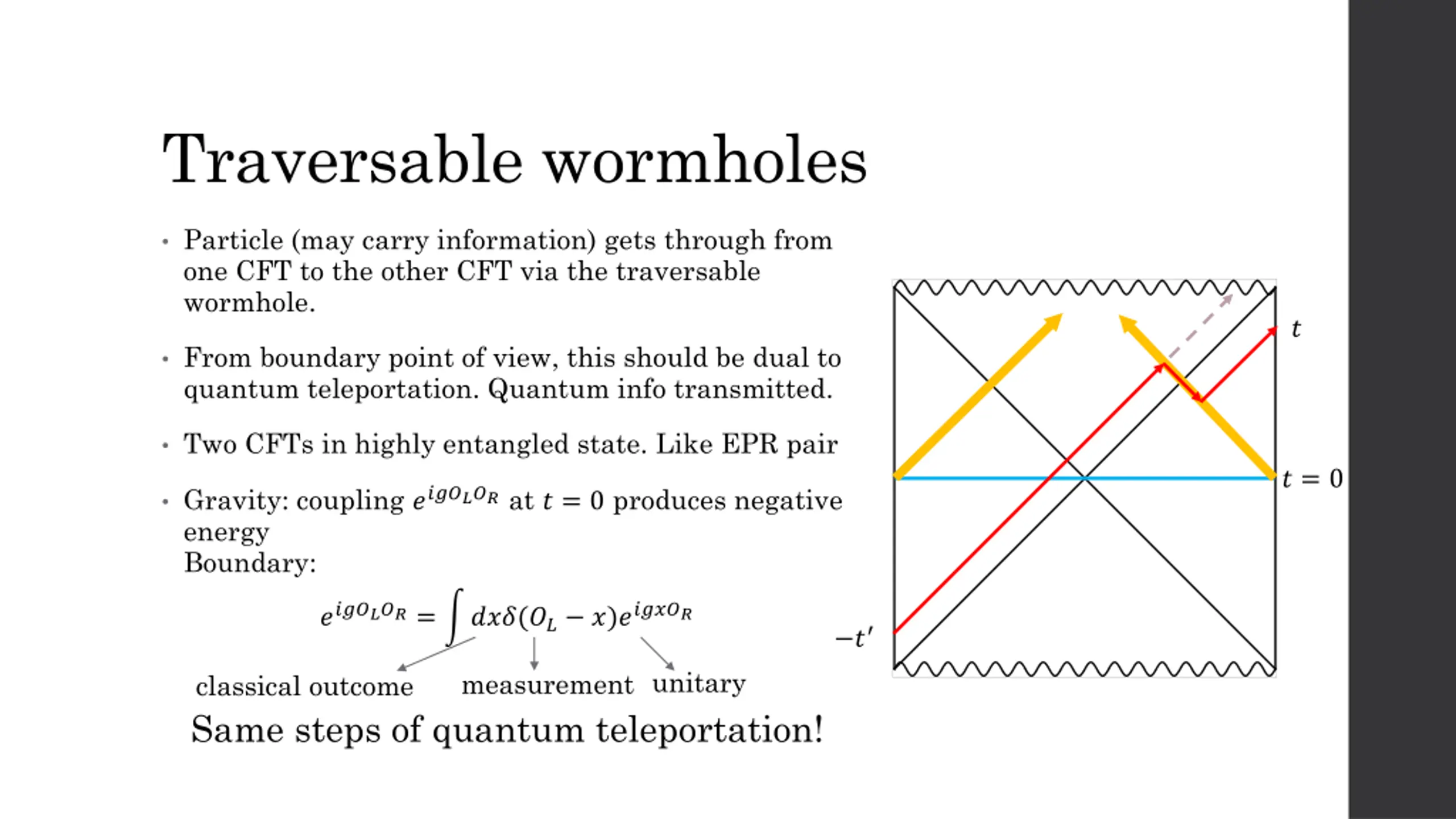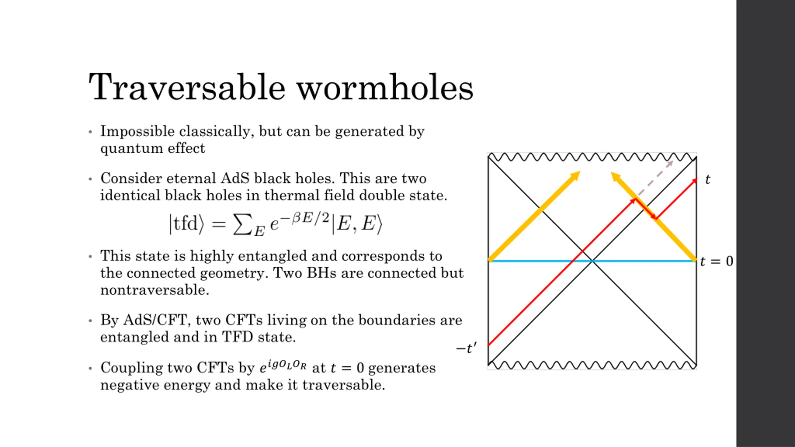 Traversable wormholes Impossible classically, but can be generated by quantum effect Consider eternal AdS black holes. This are two identical black holes in thermal field double state. ? This state is highly entangled and corresponds to the connected geometry. Two BHs are connected but nontraversable. ? = 0 By AdS/CFT, two CFTs living on the boundaries are entangled and in TFD state. ? Coupling two CFTs by ???????at ? = 0 generates negative energy and make it traversable.