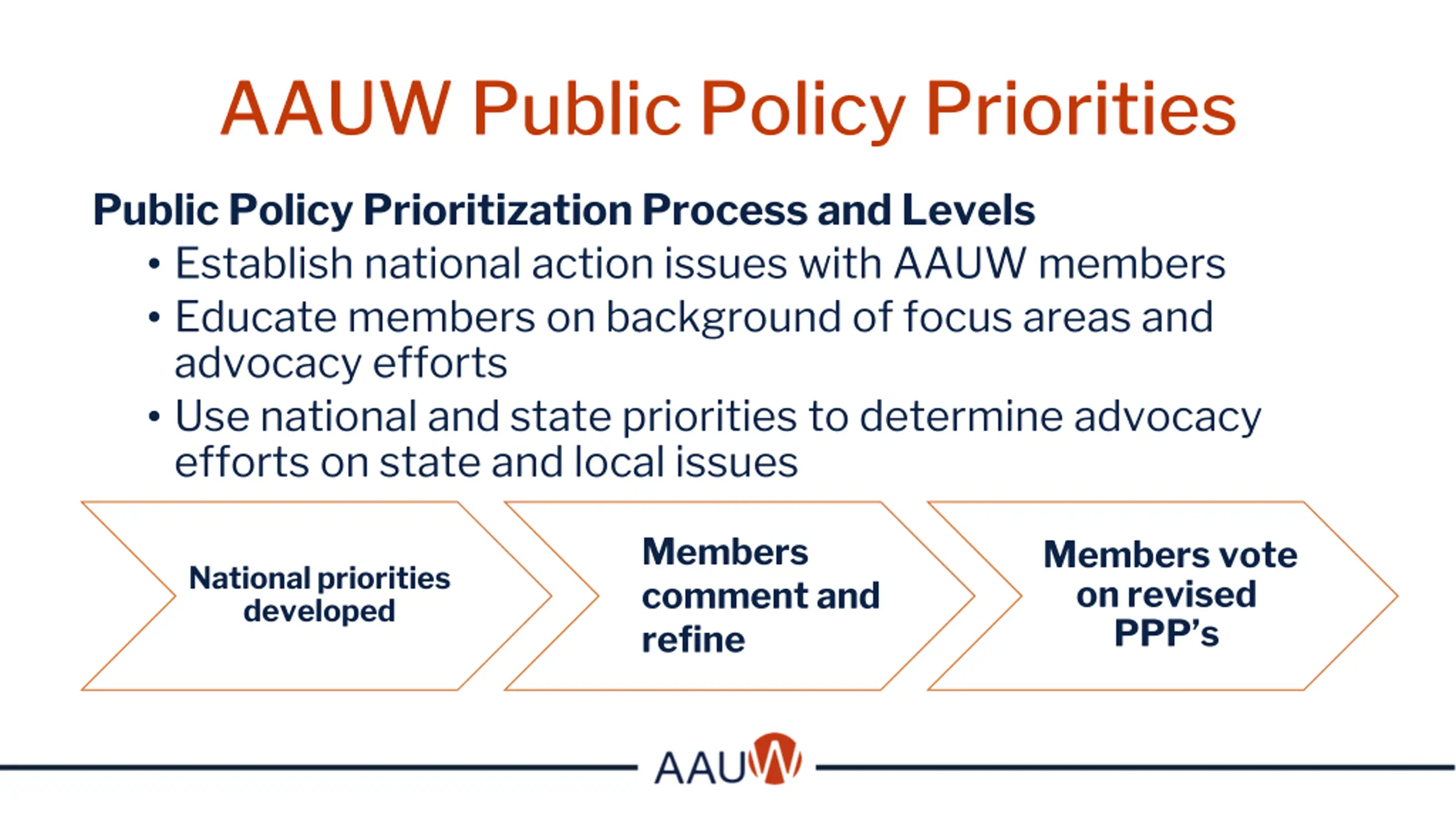AAUW Public Policy Priorities Public Policy Prioritization Process and Levels Establish national action issues with AAUW members Educate members on background of focus areas and advocacy efforts Use national and state priorities to determine advocacy efforts on state and local issues Members comment and refine Members vote on revised PPP s National priorities developed