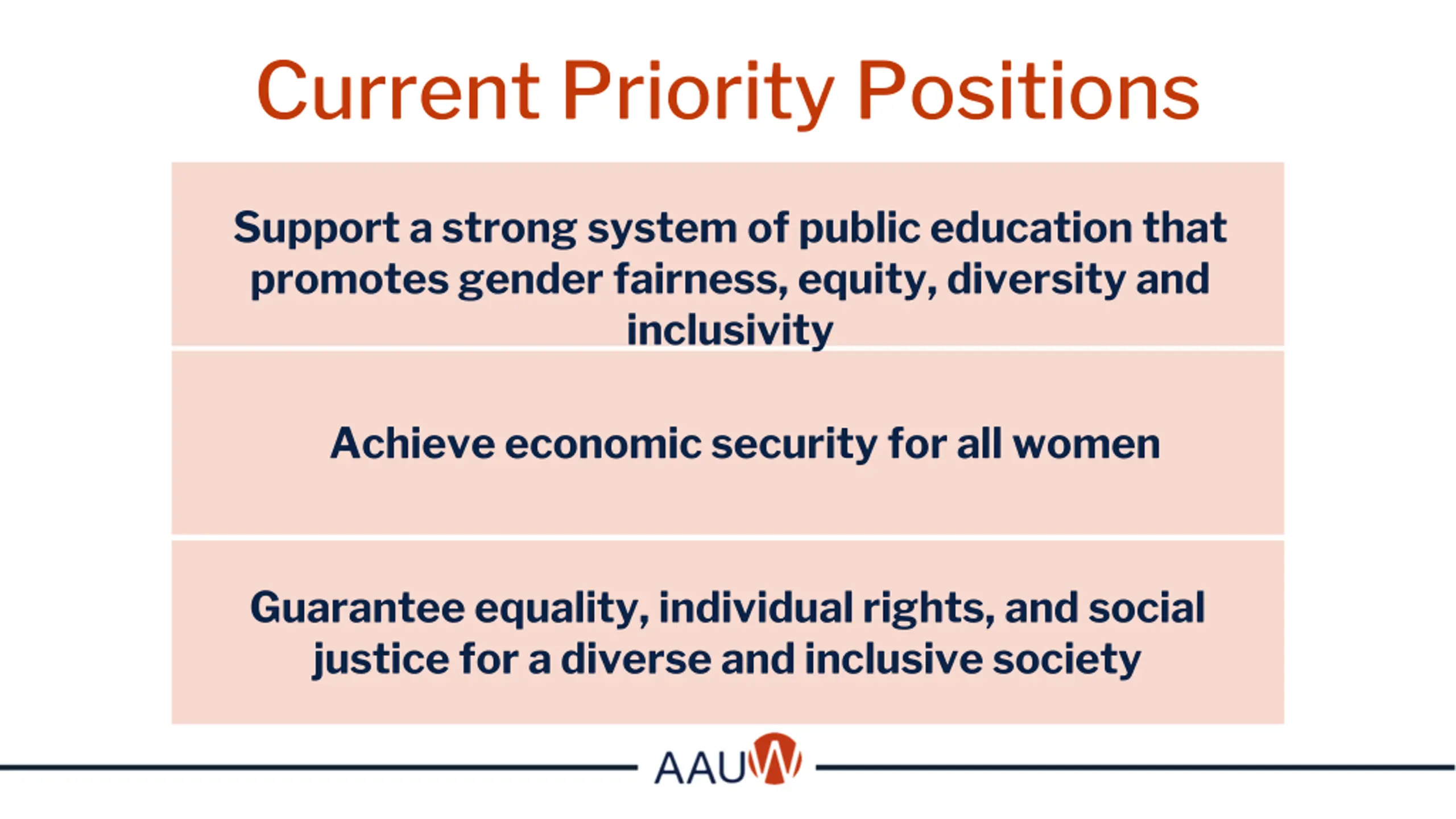Current Priority Positions Support a strong system of public education that promotes gender fairness, equity, diversity and inclusivity Achieve economic security for all women Guarantee equality, individual rights, and social justice for a diverse and inclusive society