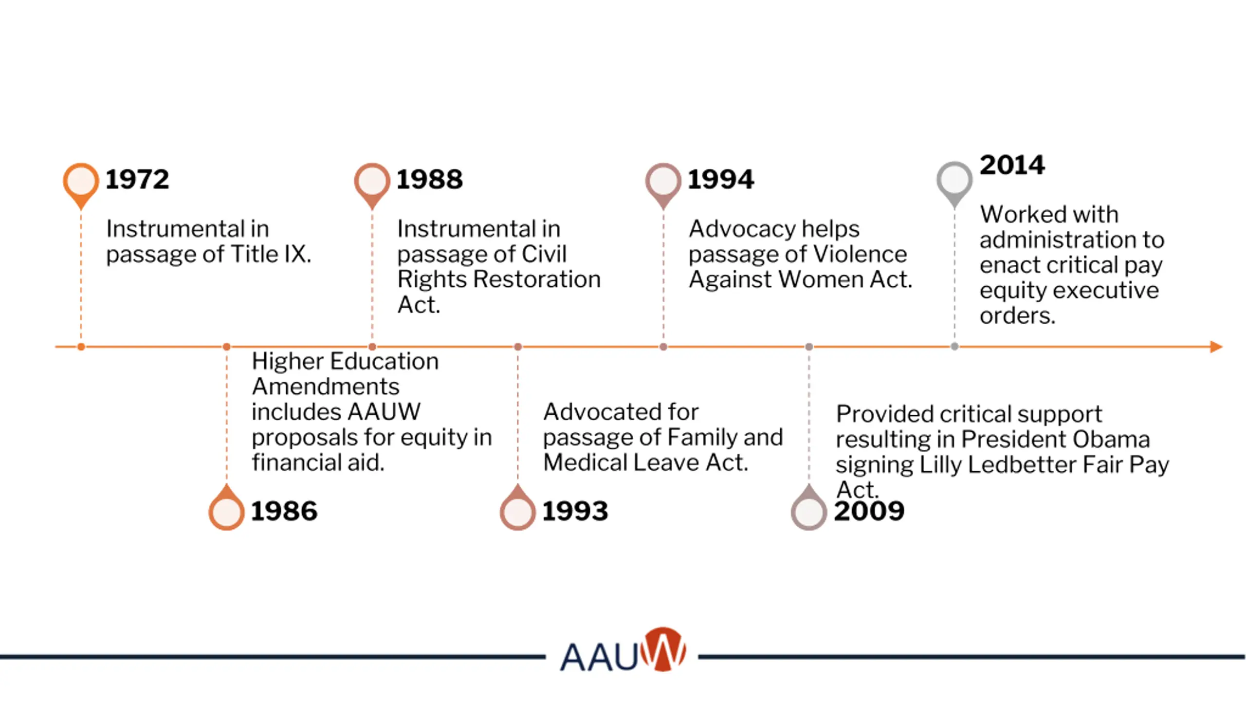 2014 1972 1988 1994 Worked with administration to enact critical pay equity executive orders. Instrumental in passage of Title IX. Instrumental in passage of Civil Rights Restoration Act. Advocacy helps passage of Violence Against Women Act. Higher Education Amendments includes AAUW proposals for equity in financial aid. Advocated for passage of Family and Medical Leave Act. Provided critical support resulting in President Obama signing Lilly Ledbetter Fair Pay Act. 1986 1993 2009