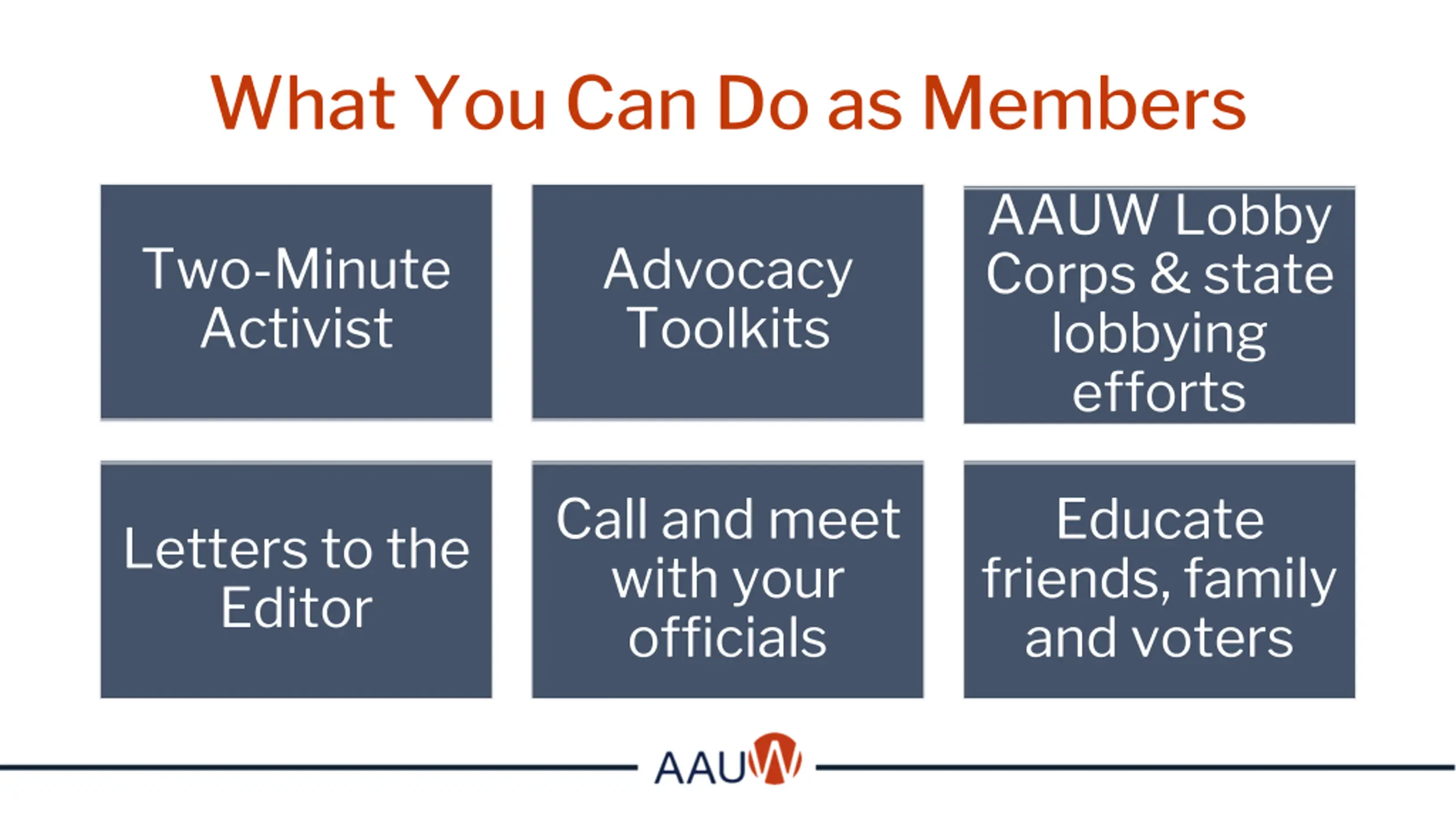 What You Can Do as Members AAUW Lobby Corps & state lobbying Call and meet with your officials Educate friends, family and voters efforts Two-Minute Advocacy Toolkits Two-Minute Activist Activist AAUW Lobby Corps & state lobbying efforts Call and meet with your Educate friends, family and voters Letters to the Editor Editor Advocacy Toolkits officials Letters to the