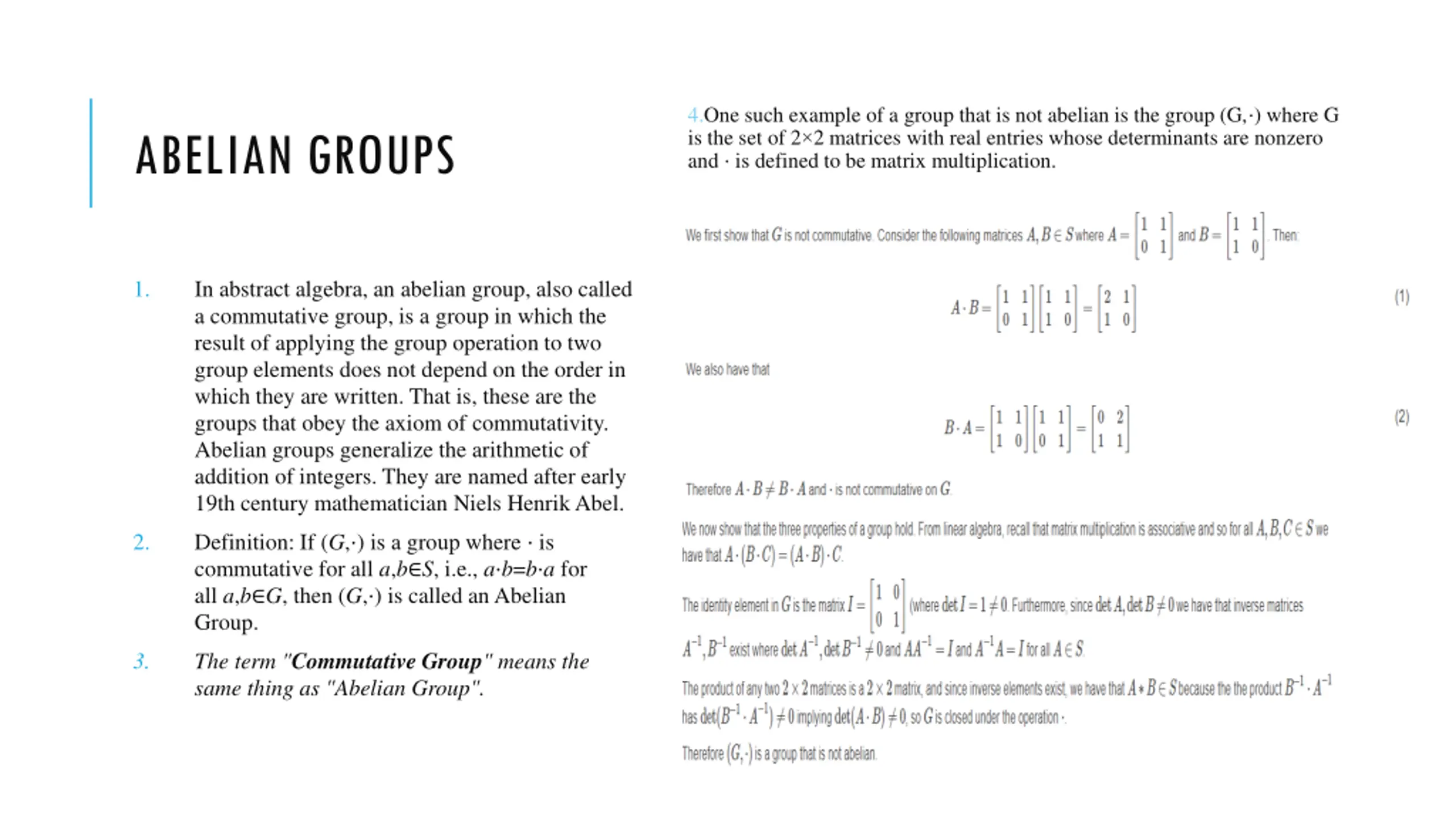 4.One such example of a group that is not abelian is the group (G,) where G is the set of 2 2 matrices with real entries whose determinants are nonzero and is defined to be matrix multiplication. ABELIAN GROUPS 1. In abstract algebra, an abelian group, also called a commutative group, is a group in which the result of applying the group operation to two group elements does not depend on the order in which they are written. That is, these are the groups that obey the axiom of commutativity. Abelian groups generalize the arithmetic of addition of integers. They are named after early 19th century mathematician Niels Henrik Abel. 2. Definition: If (G, ) is a group where is commutative for all a,b S, i.e., a b=b a for all a,b G, then (G, ) is called an Abelian Group. The term "Commutative Group" means the same thing as "Abelian Group". 3.