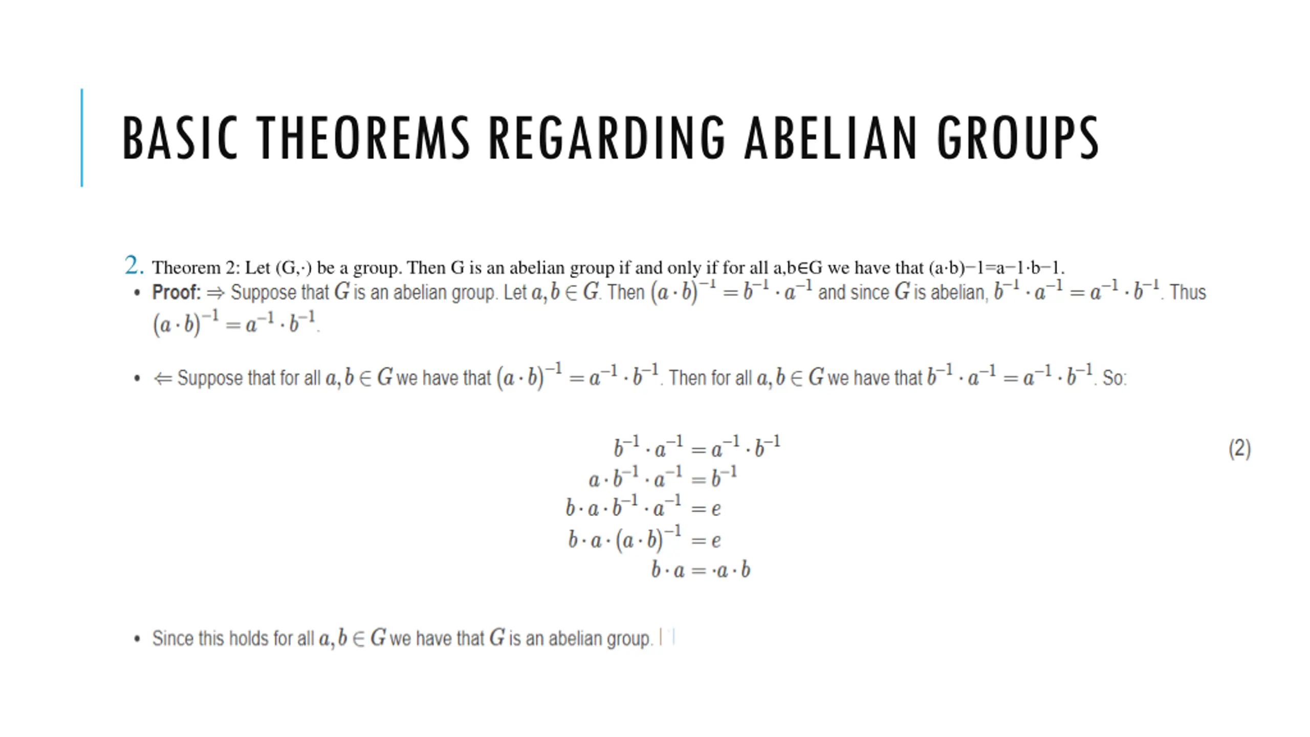 BASIC THEOREMS REGARDING ABELIAN GROUPS 2. Theorem 2: Let (G, ) be a group. Then G is an abelian group if and only if for all a,b G we have that (a b) 1=a 1 b 1.