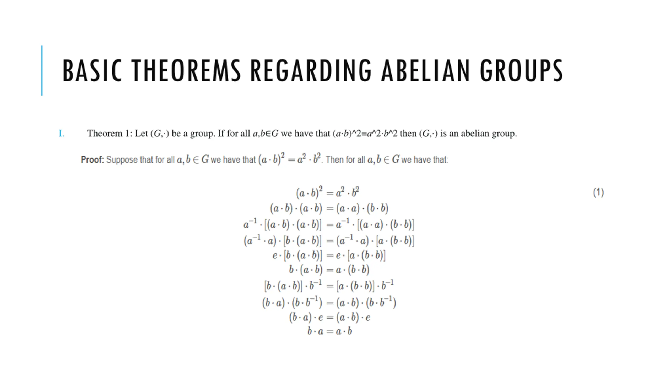 BASIC THEOREMS REGARDING ABELIAN GROUPS I. Theorem 1: Let (G, ) be a group. If for all a,b G we have that (a b)^2=a^2 b^2 then (G, ) is an abelian group.