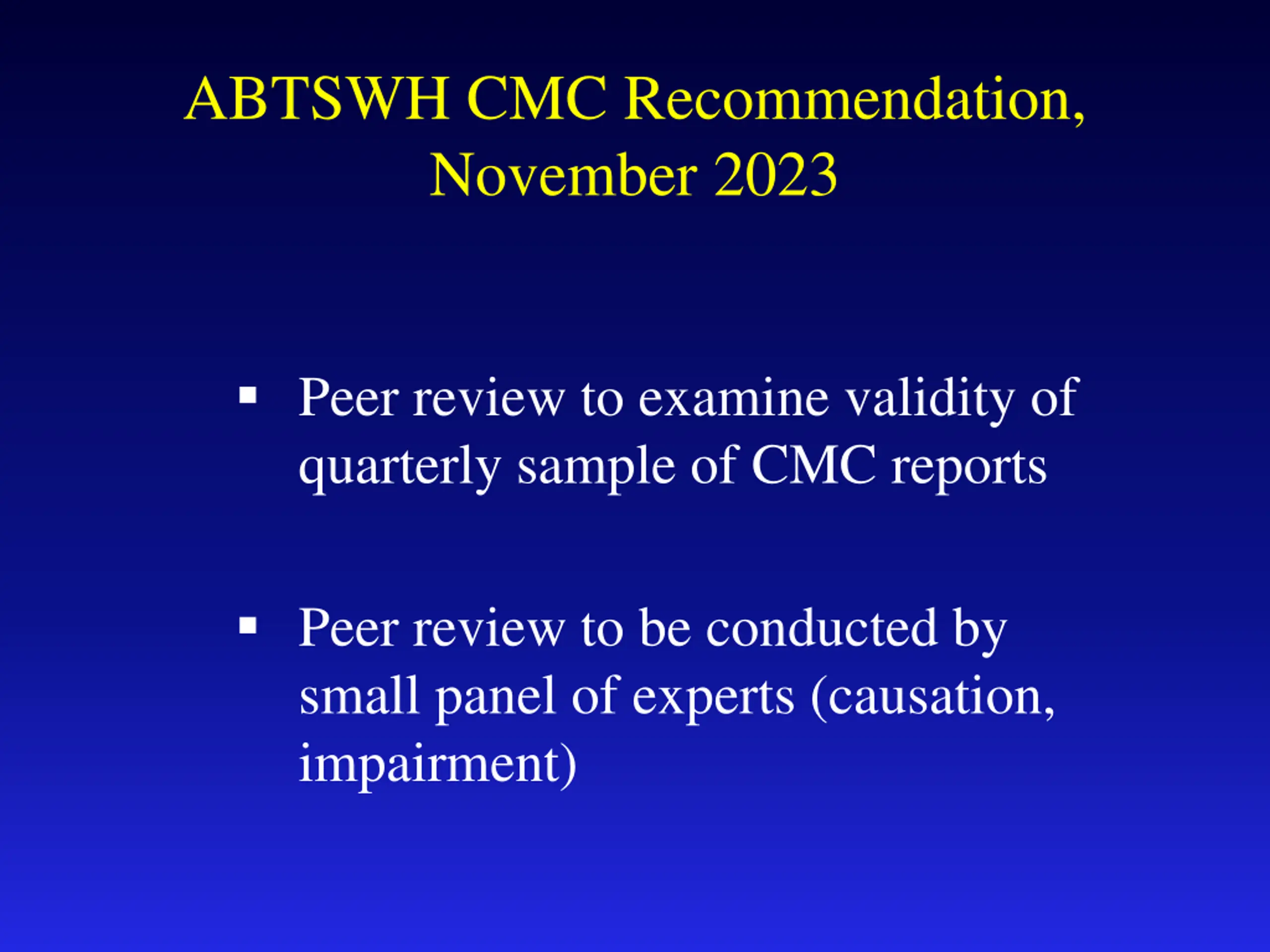 ABTSWH CMC Recommendation, November 2023 Peer review to examine validity of quarterly sample of CMC reports Peer review to be conducted by small panel of experts (causation, impairment)