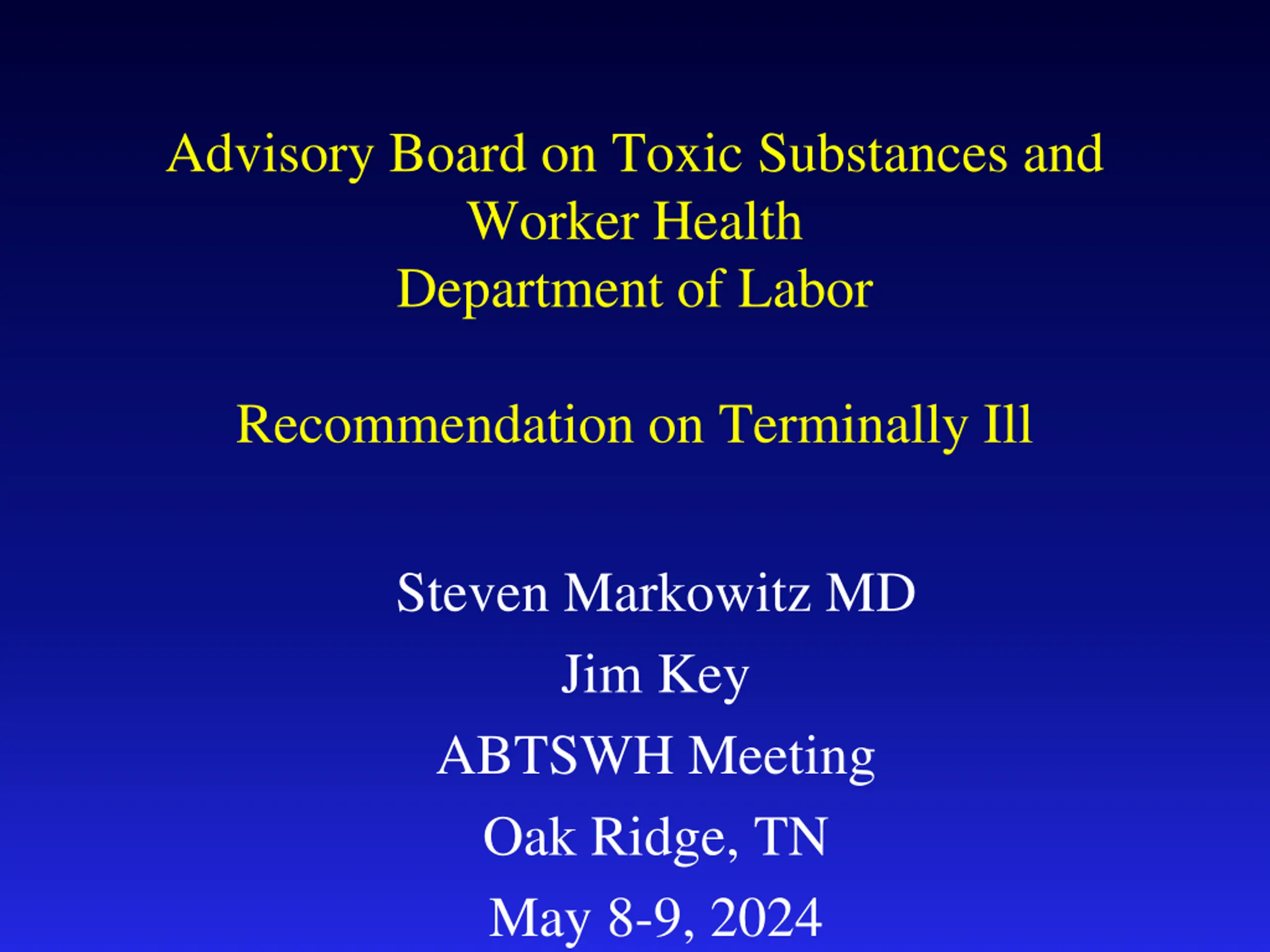 Advisory Board on Toxic Substances and Worker Health Department of Labor Recommendation on Terminally Ill Steven Markowitz MD Jim Key ABTSWH Meeting Oak Ridge, TN May 8-9, 2024