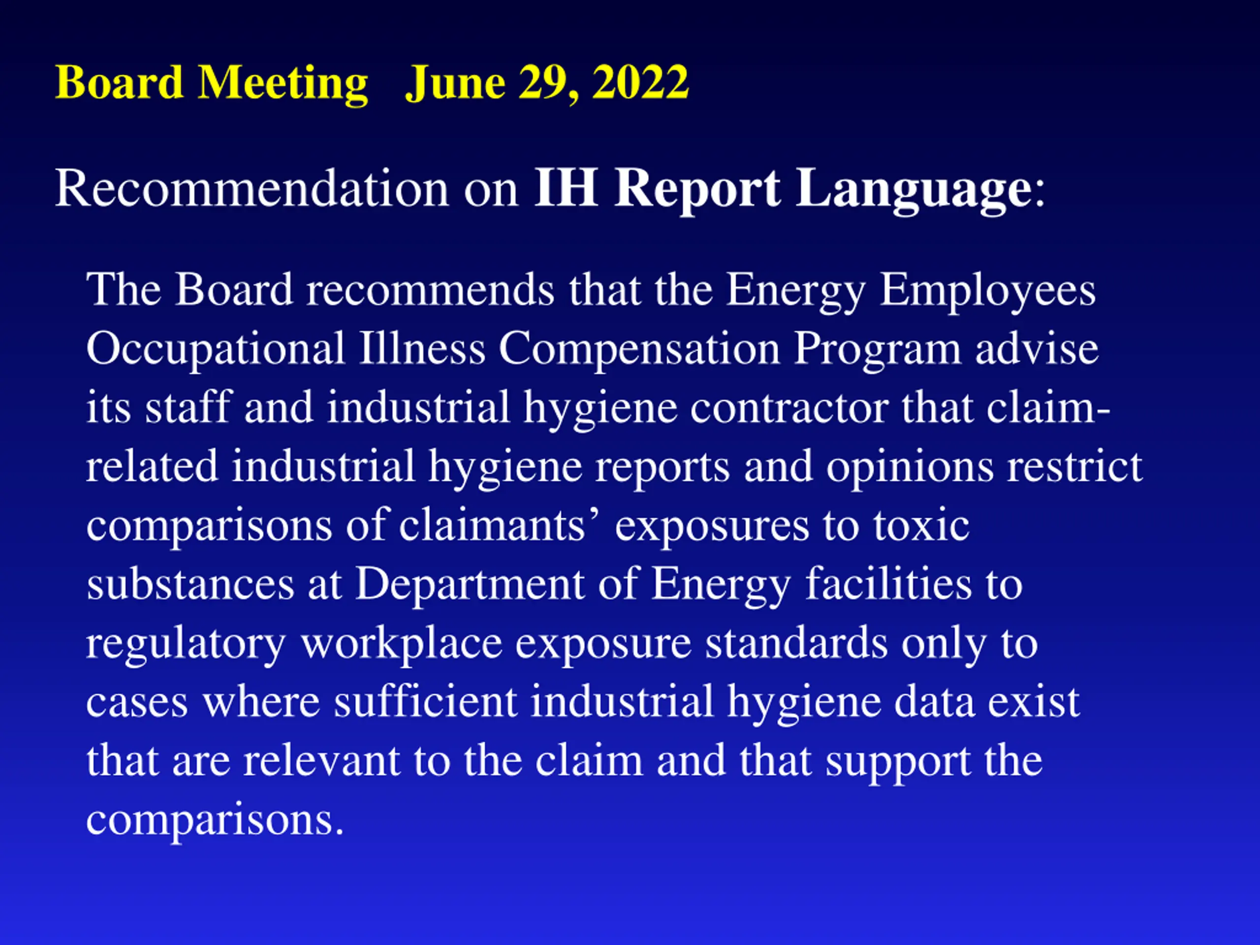 Board Meeting June 29, 2022 Recommendation on IH Report Language: The Board recommends that the Energy Employees Occupational Illness Compensation Program advise its staff and industrial hygiene contractor that claim- related industrial hygiene reports and opinions restrict comparisons of claimants exposures to toxic substances at Department of Energy facilities to regulatory workplace exposure standards only to cases where sufficient industrial hygiene data exist that are relevant to the claim and that support the comparisons.