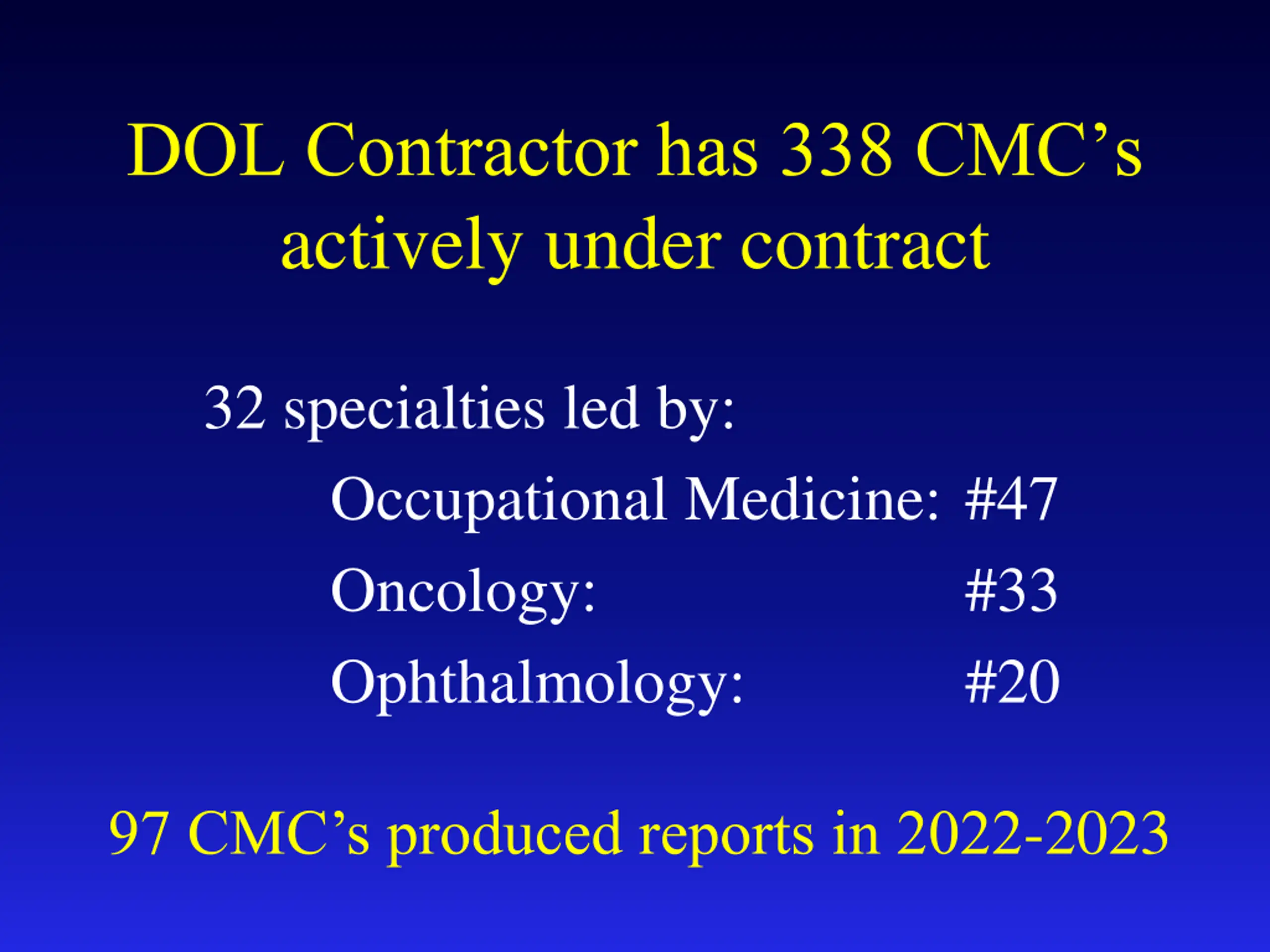 DOL Contractor has 338 CMCs actively under contract 32 specialties led by: Occupational Medicine: #47 Oncology: Ophthalmology: #33 #20 97 CMC s produced reports in 2022-2023