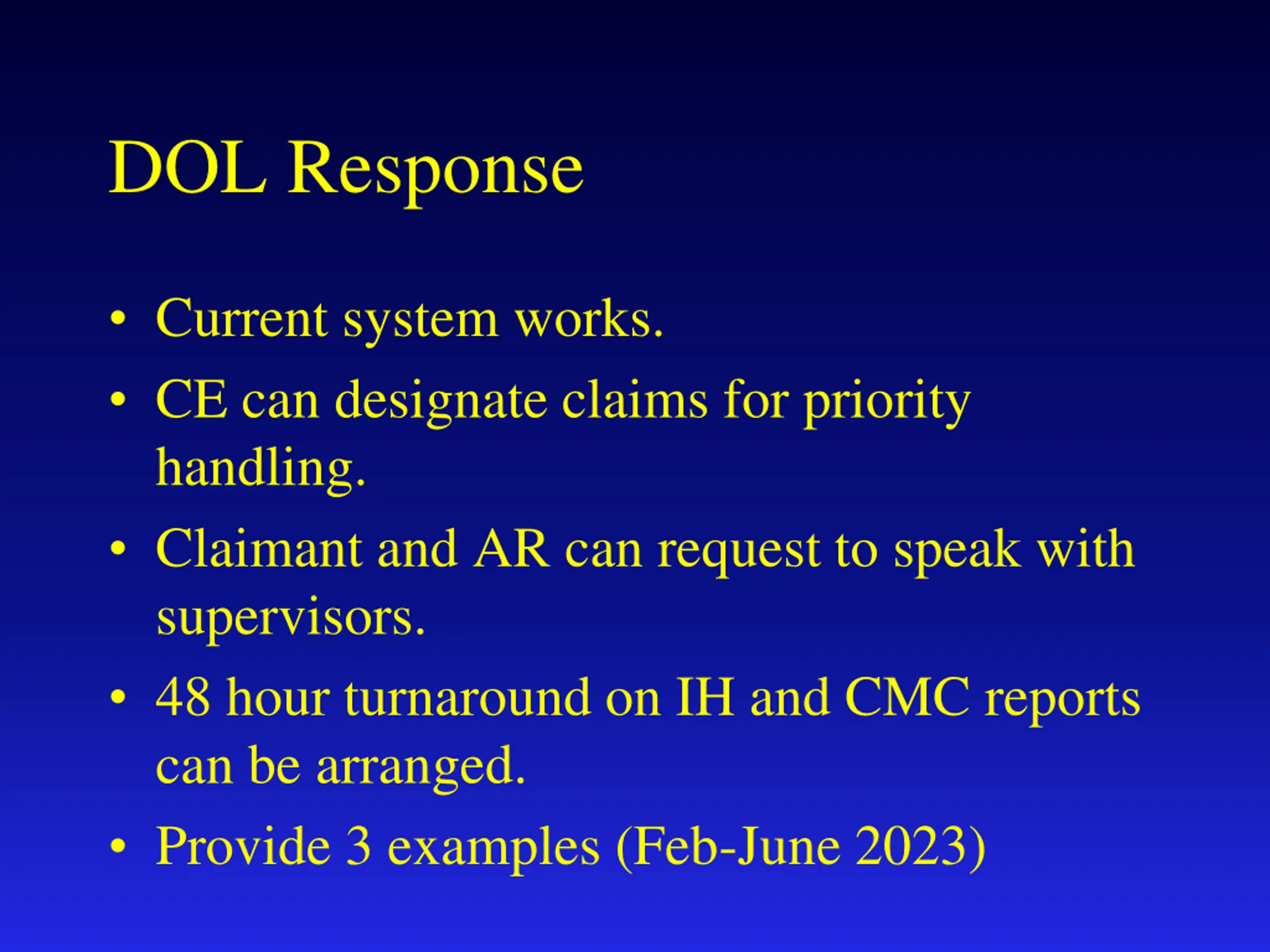 DOL Response Current system works. CE can designate claims for priority handling. Claimant and AR can request to speak with supervisors. 48 hour turnaround on IH and CMC reports can be arranged. Provide 3 examples (Feb-June 2023)
