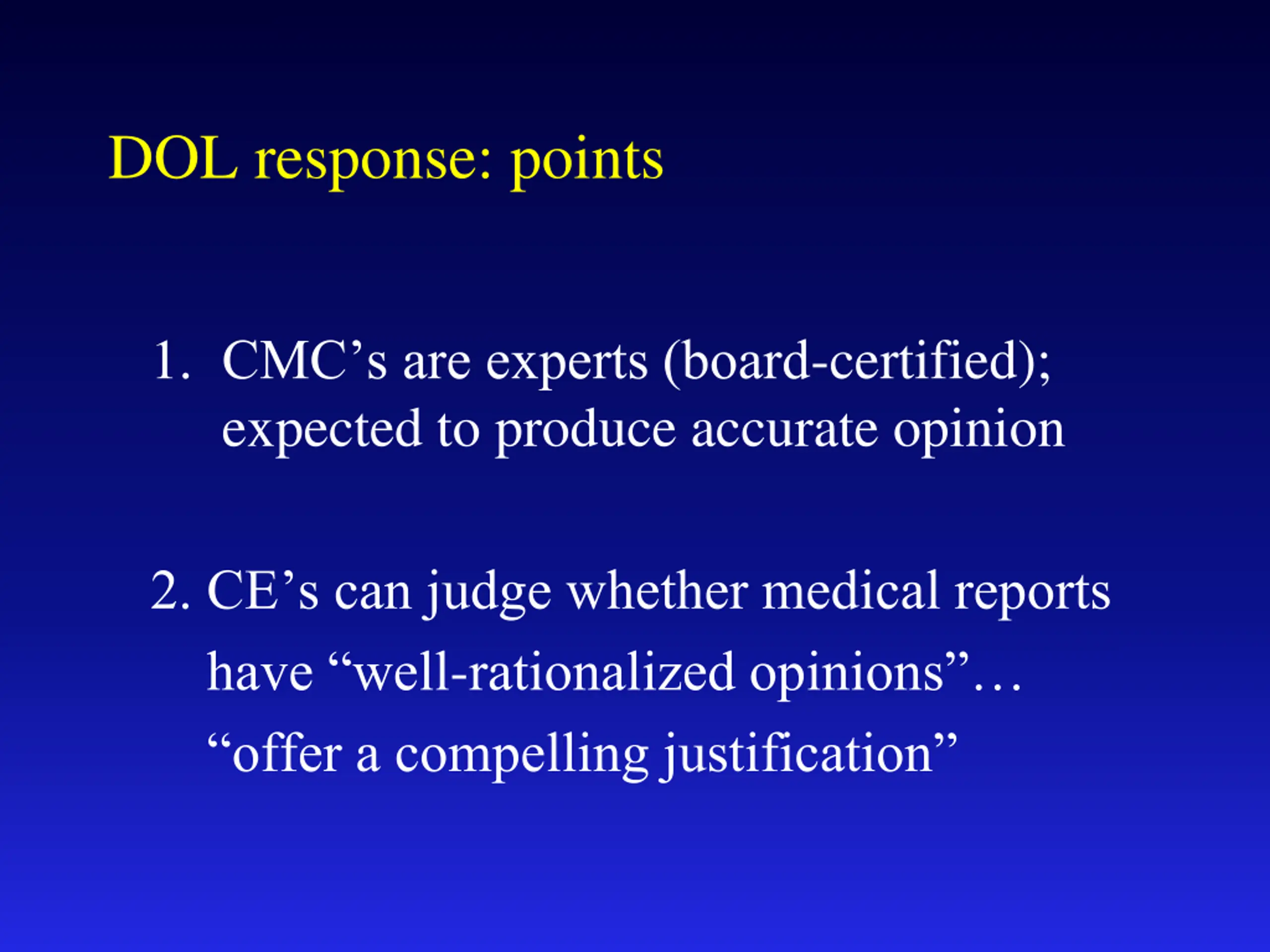 DOL response: points 1. CMC s are experts (board-certified); expected to produce accurate opinion 2. CE s can judge whether medical reports have well-rationalized opinions offer a compelling justification